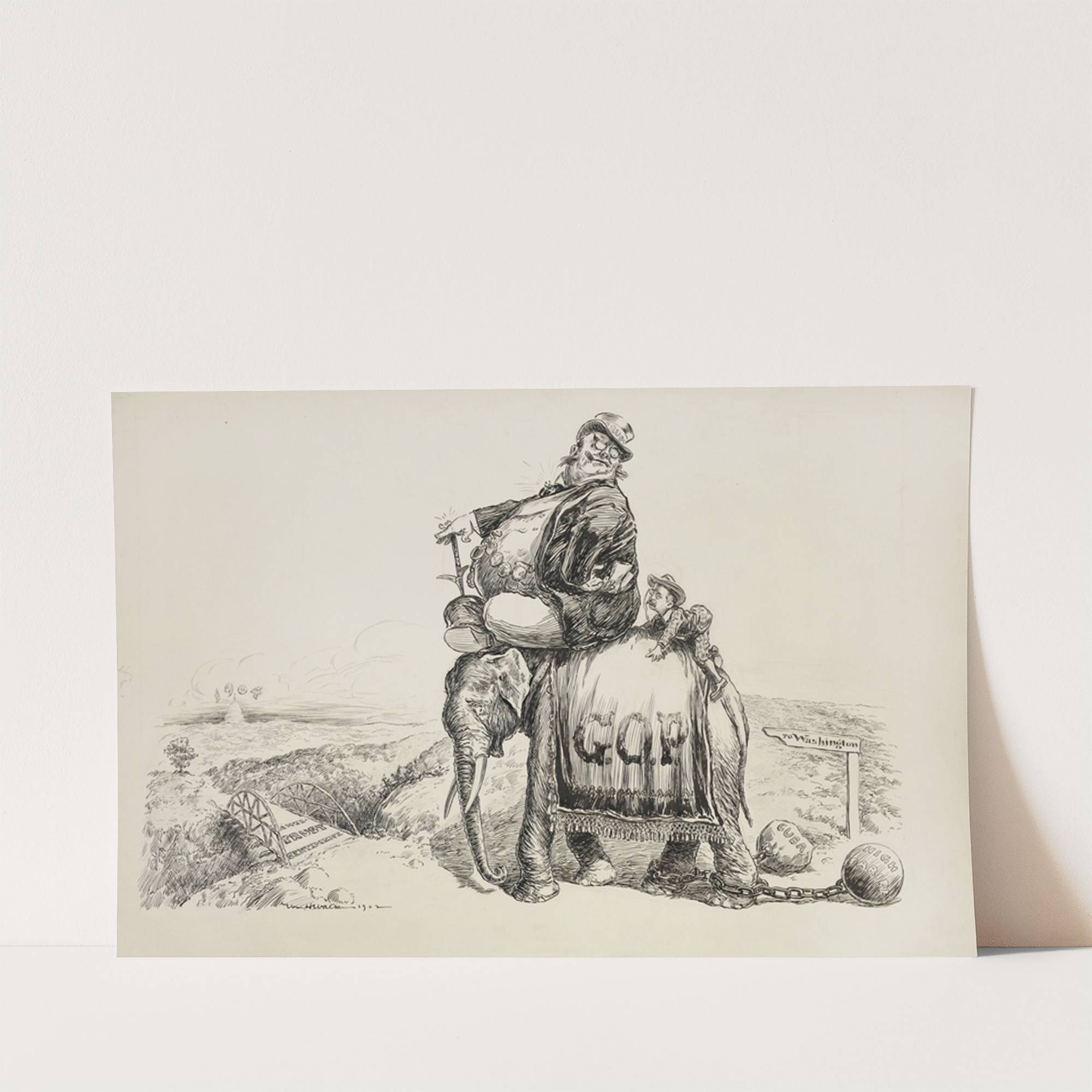The Republican Party elephant struggling to walk towards Washington in 1904, with weights representing Cuba and high tariffs tied to its ankles (1902) by William Henry Walker - Wall Art Print