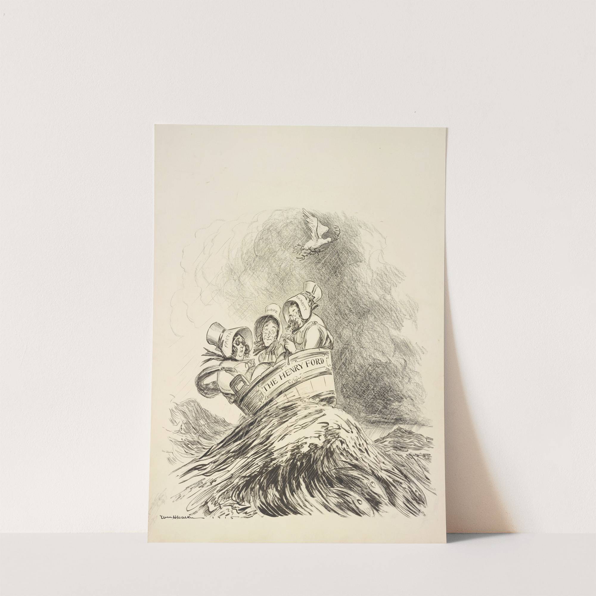 Three men dressed as women with bonnets reading Faith, Hope, and Charity ride on a stormy sea in a washtub labeled ‘The Henry Ford’ (1915) by William Henry Walker - Wall Art Print
