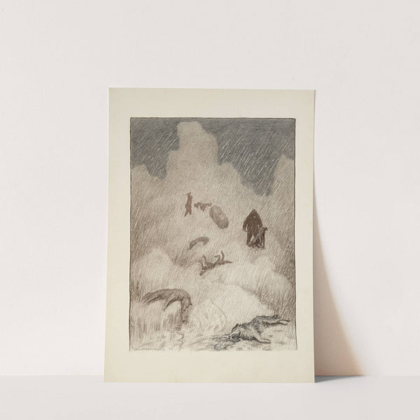 Through a storm, two figures can be seen clubbing dogs or wolves. The bodies of four others lie on the ground. (1897) by William Henry Walker - Wall Art Print