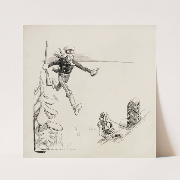 Uncle Sam runs to stop a small man, representing Canada, who is moving the 1825 Alaska Boundary Monument. (1902) by William Henry Walker - Wall Art Print