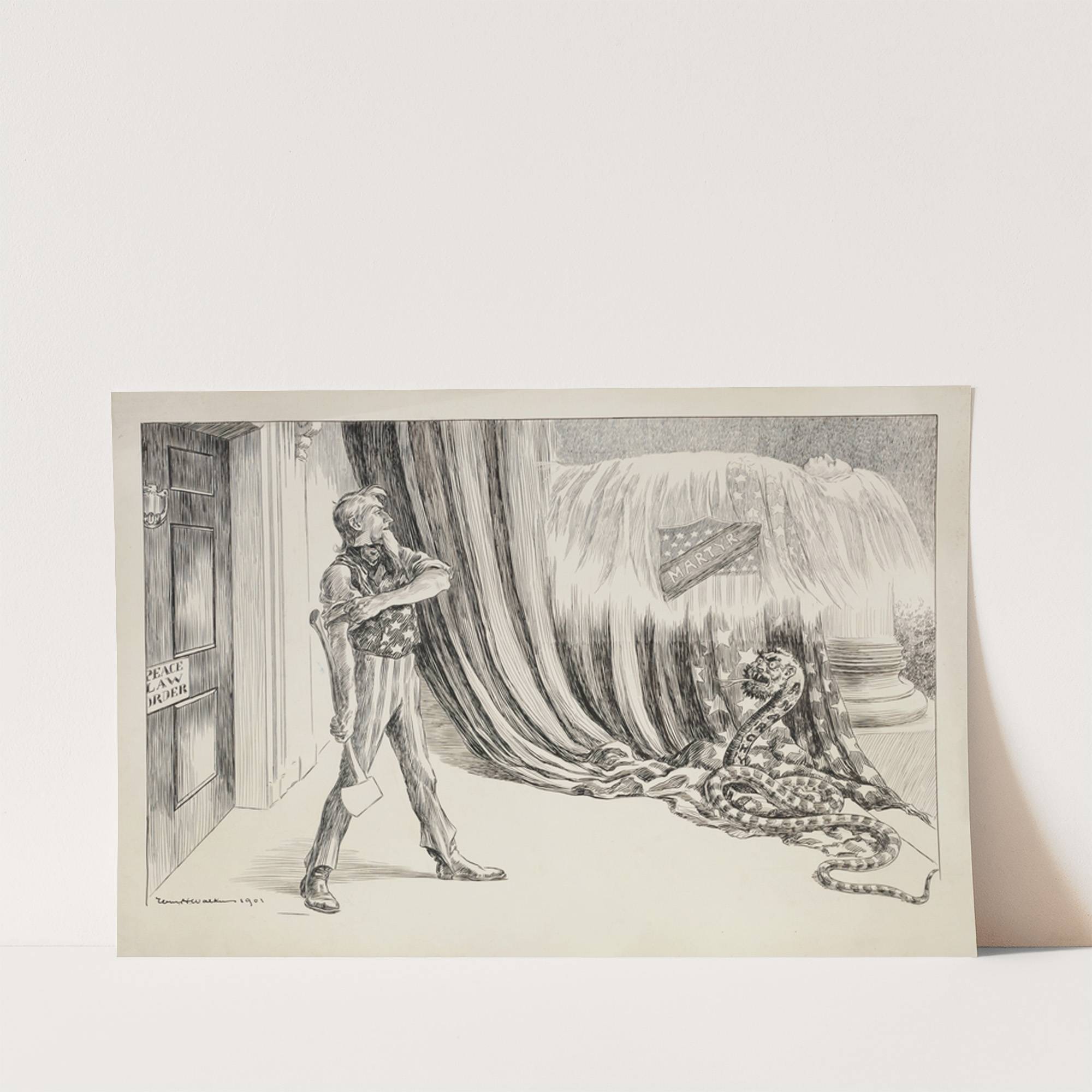 Uncle Sam stands before a door labeled ‘peace, law, order’ and prepares to strike a snake representing anarchy (1902) by William Henry Walker - Wall Art Print