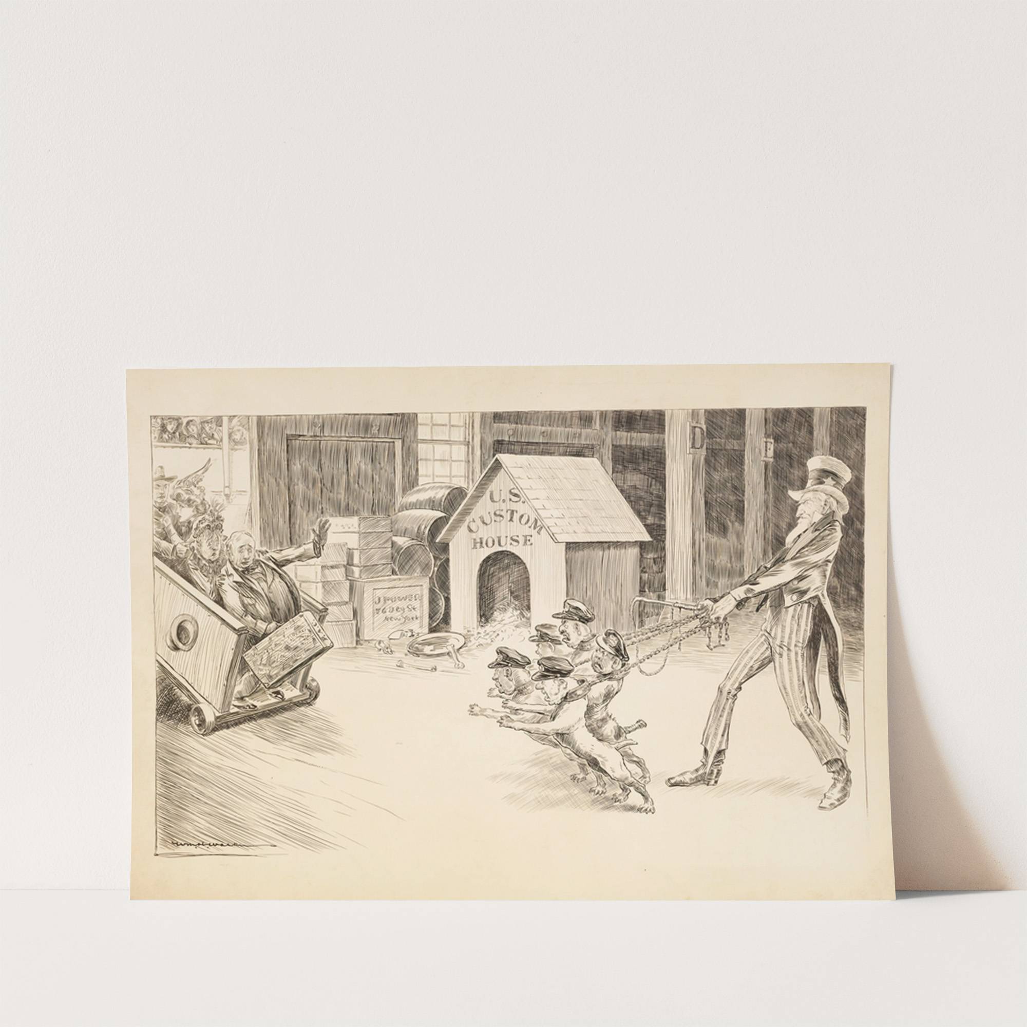 Uncle Sam with U.S. Custom Officials depicted as attack dogs, confronting passengers as they disembark from a ship after a world cruise. (1906) by William Henry Walker - Wall Art Print