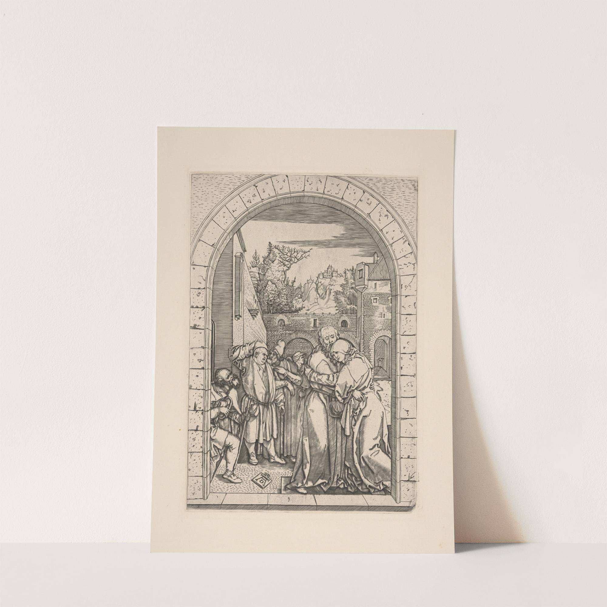 This exquisite art print features "The Meeting of Joachim and Anne at the Golden Gate" by Albrecht Dürer, a masterpiece from the Renaissance period. The monochromatic illustration is rendered in detailed black ink, showcasing intricate line work and meticulous attention...