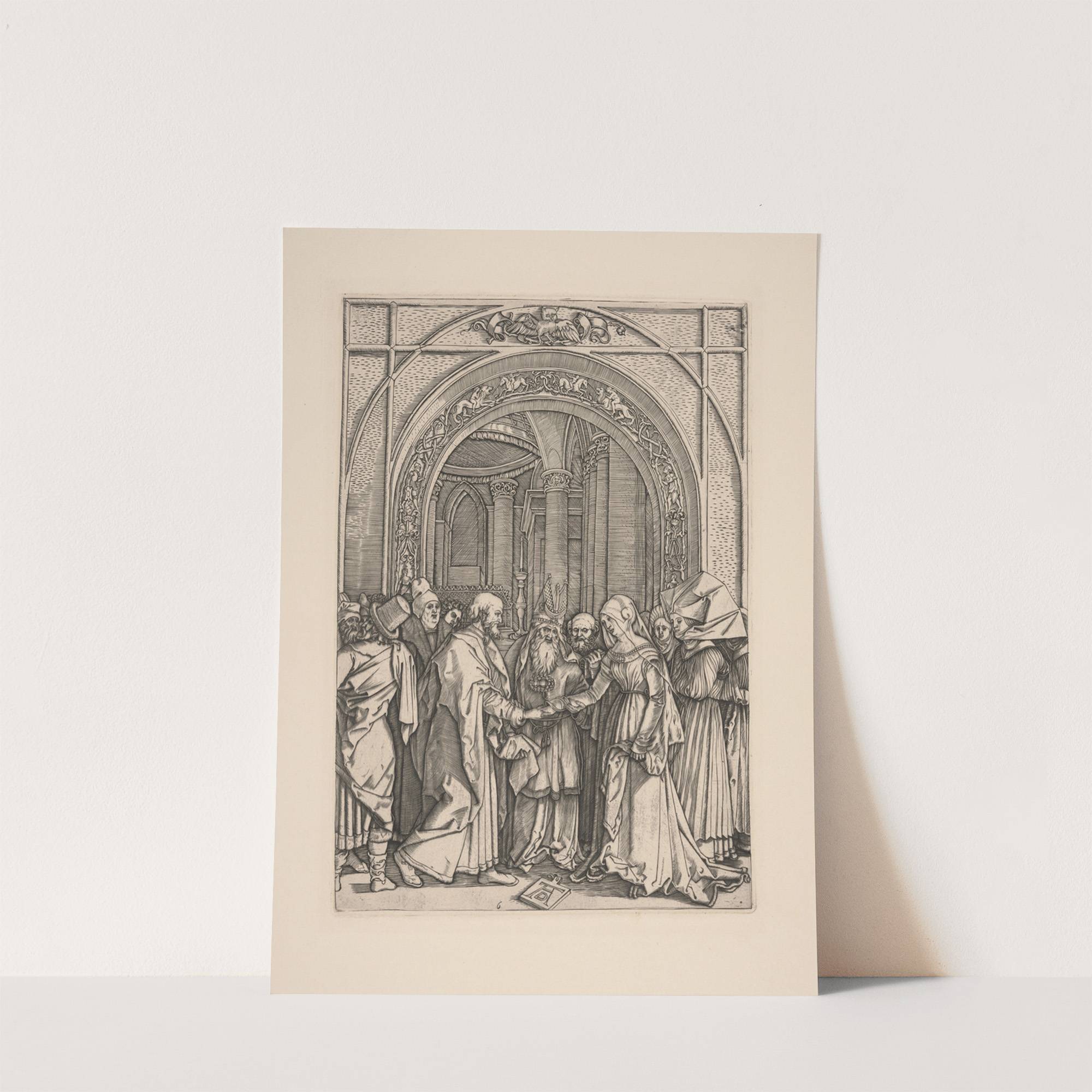 This black-and-white illustration depicts "The Marriage of the Virgin" by Albrecht Dürer, showcasing intricate detailing and classic Renaissance style. The central figure, Mary, stands out with her serene expression and delicate features, receiving a blessing from an elderly bishop adorned...