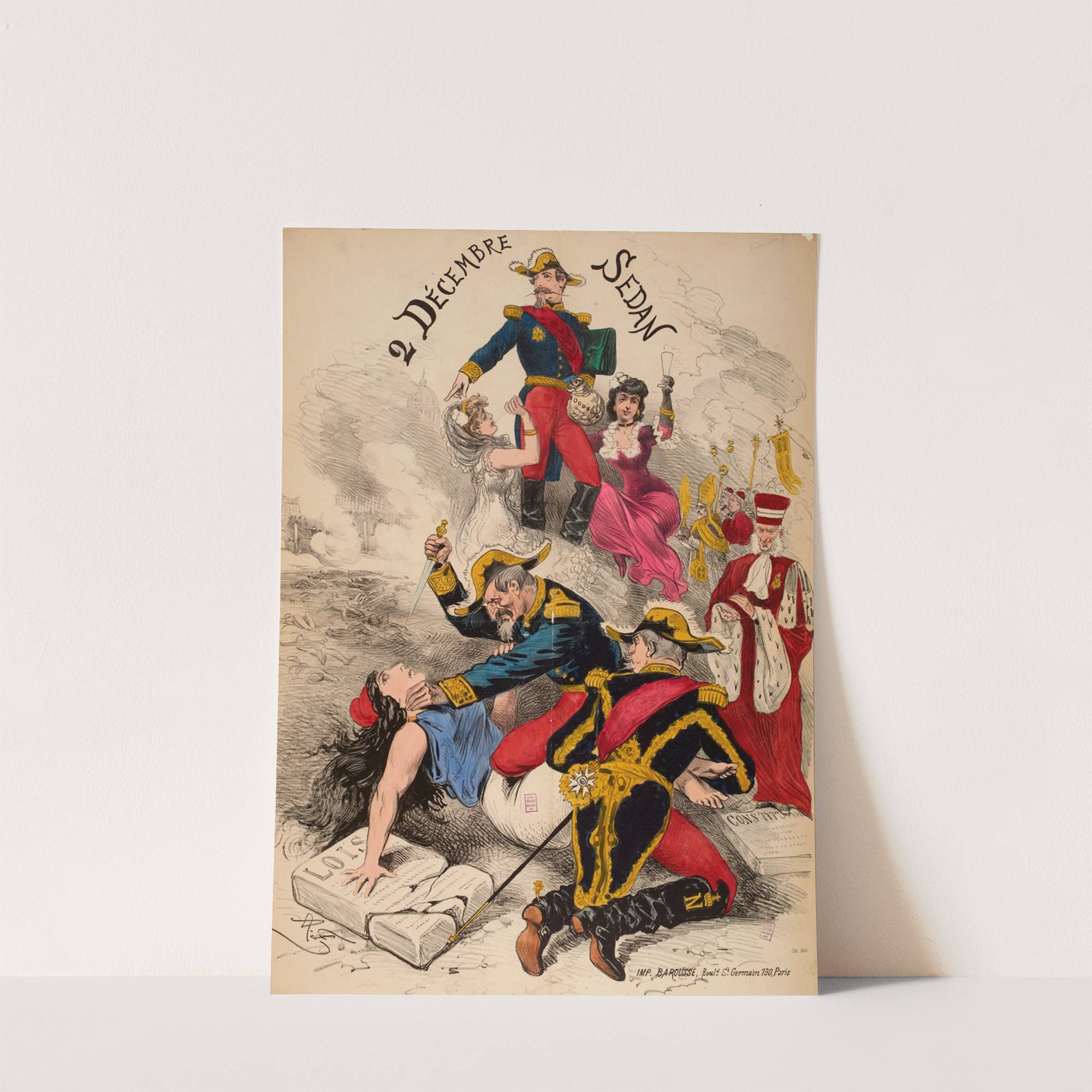 This vibrant cartoon print titled "2 Décembre Seduction" by Alexandre Ferdinandus showcases a dynamic historical satire with vivid colors and expressive linework. The scene depicts a dramatic confrontation between a military officer, dressed in a blue coat with gold epaulettes...