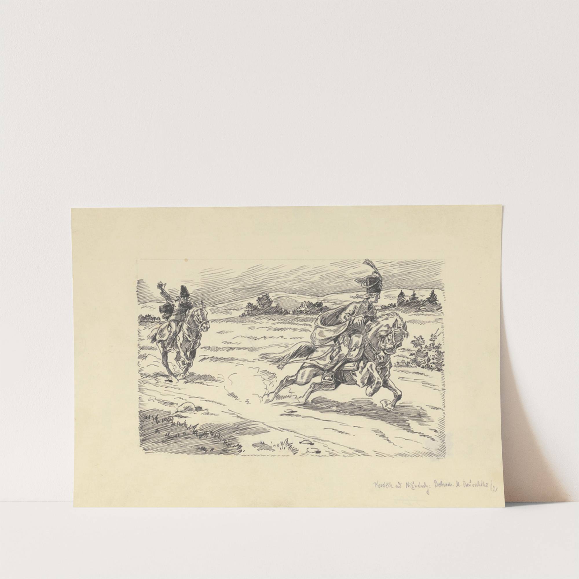 This striking monochrome print features "25. – I Can’t Anymore, My Lord…," a dynamic artwork by Andrej Kováčik. The piece captures a high-energy scene with three soldiers in mid-chase across an open, rural landscape. Each soldier is depicted in detailed...
