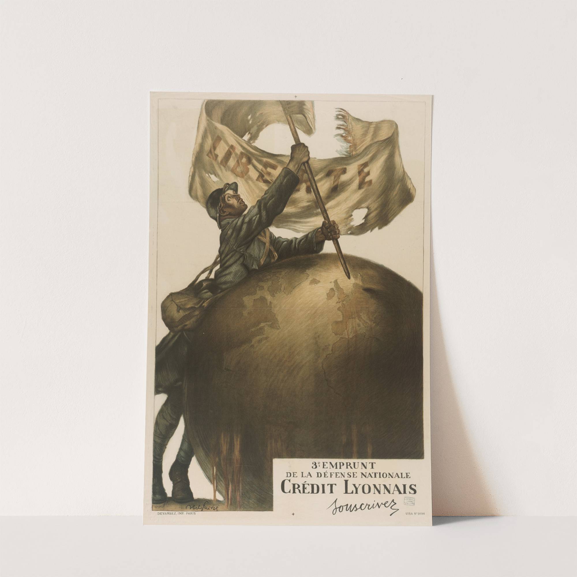 This art print features an evocative and powerful illustration titled "3e Emprunt de la Défense Nationale, Crédit Lyonnais, Souscrivez (1917)" by Abel Faivre. The composition is a dynamic portrayal of a French soldier standing atop a large sphere that represents...
