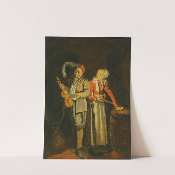 This captivating oil painting by Jan Miense Molenaer depicts a charming scene of a young boy and girl illuminated by soft candlelight, exuding an ambiance of warm intimacy and joyous camaraderie. The boy stands on the left, his light gray...