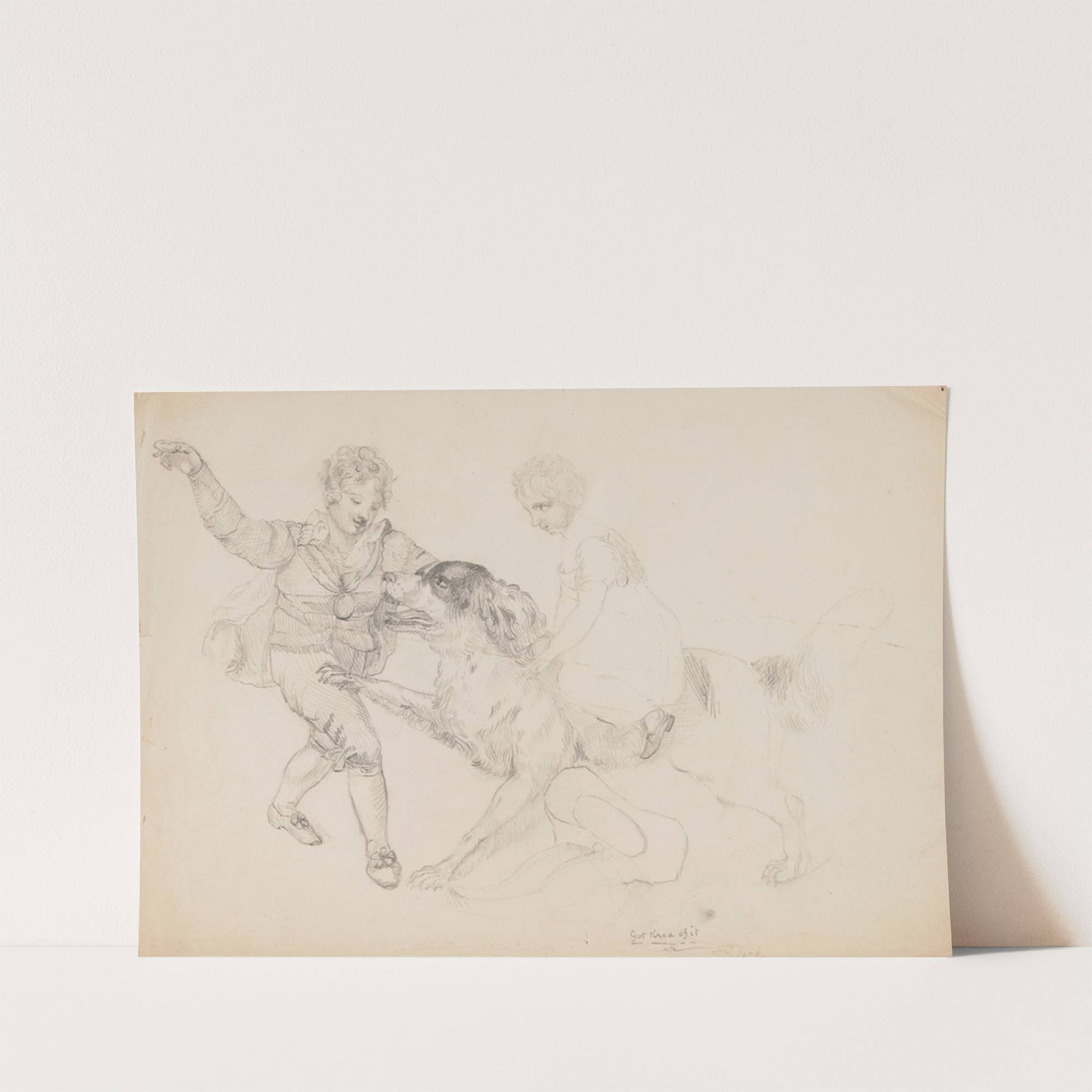 A boy and a girl playing with a large dog by Richard Sanger Smith - Wall Art Print