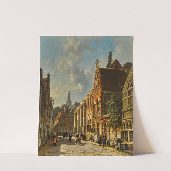 Experience the charm of early 19th-century European city life with this captivating artwork titled "A Busy Street in Summer" by Adrianus Eversen. This exquisite painting depicts a bustling cobblestone street, bathed in warm sunlight filtering through a partly cloudy sky....