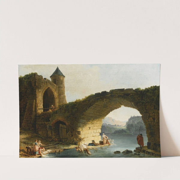 A Capriccio River Landscape With Washerwomen Near A Ruined Bridge by Hubert Robert - Wall Art Print