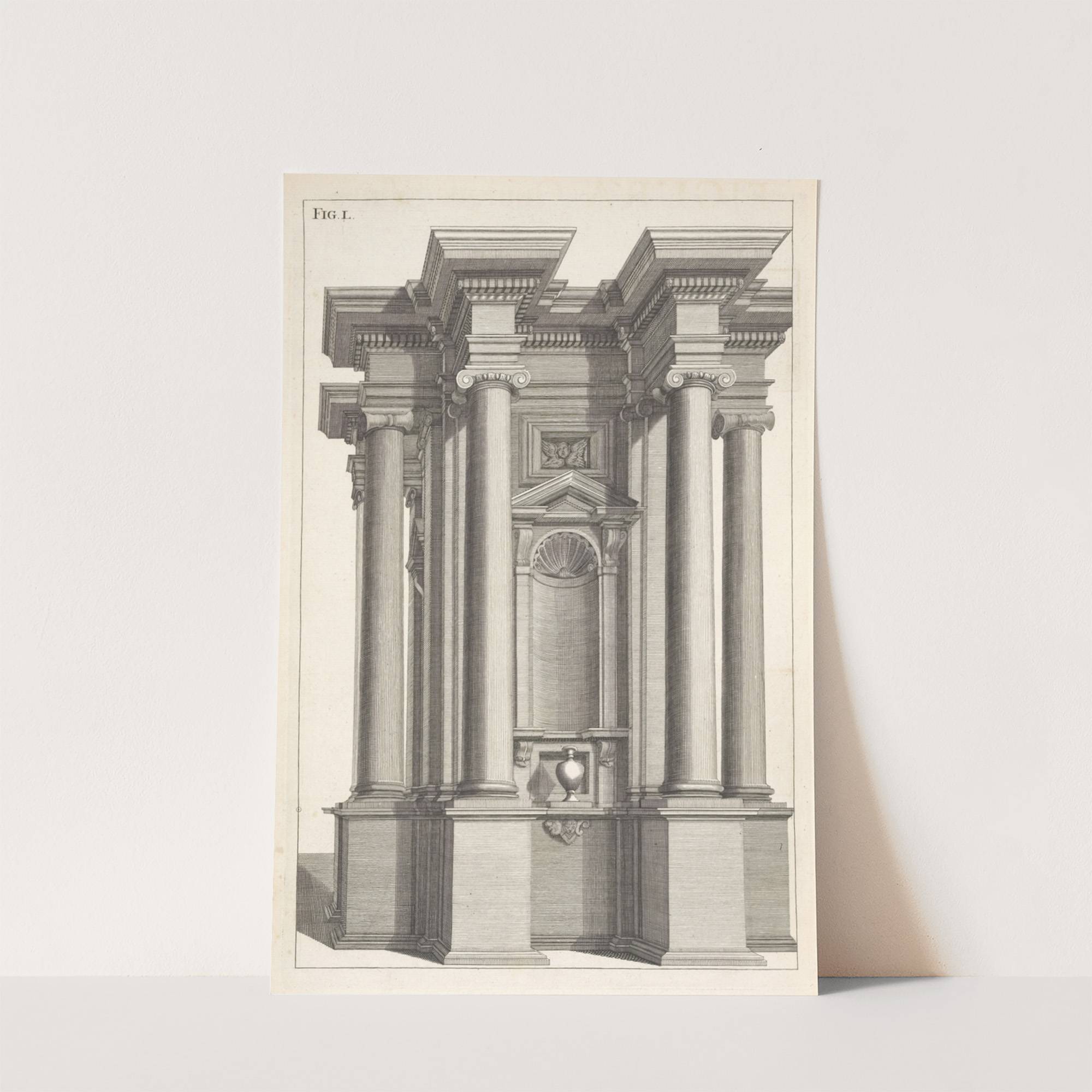 This artwork showcases a meticulous architectural rendering of Ionic columns in a classical style, created by the artist Andrea Pozzo. The monochromatic sketch captures the intricate details and textures of the columns with remarkable precision. The image features four robust,...