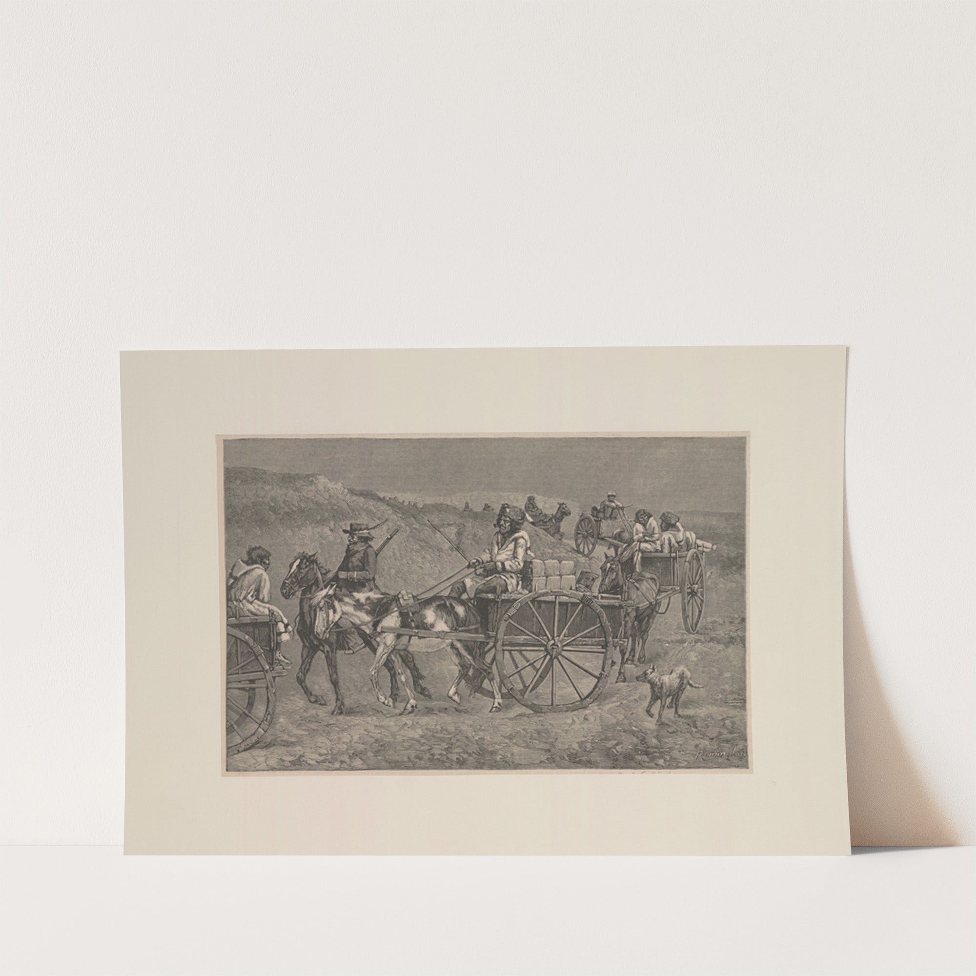This stunning black-and-white illustration captures a meticulously detailed scene of a horse-drawn wagon traveling along a rustic path in what appears to be the late 19th century. The artist, Frederic Remington, is renowned for his realistic and evocative depictions of...