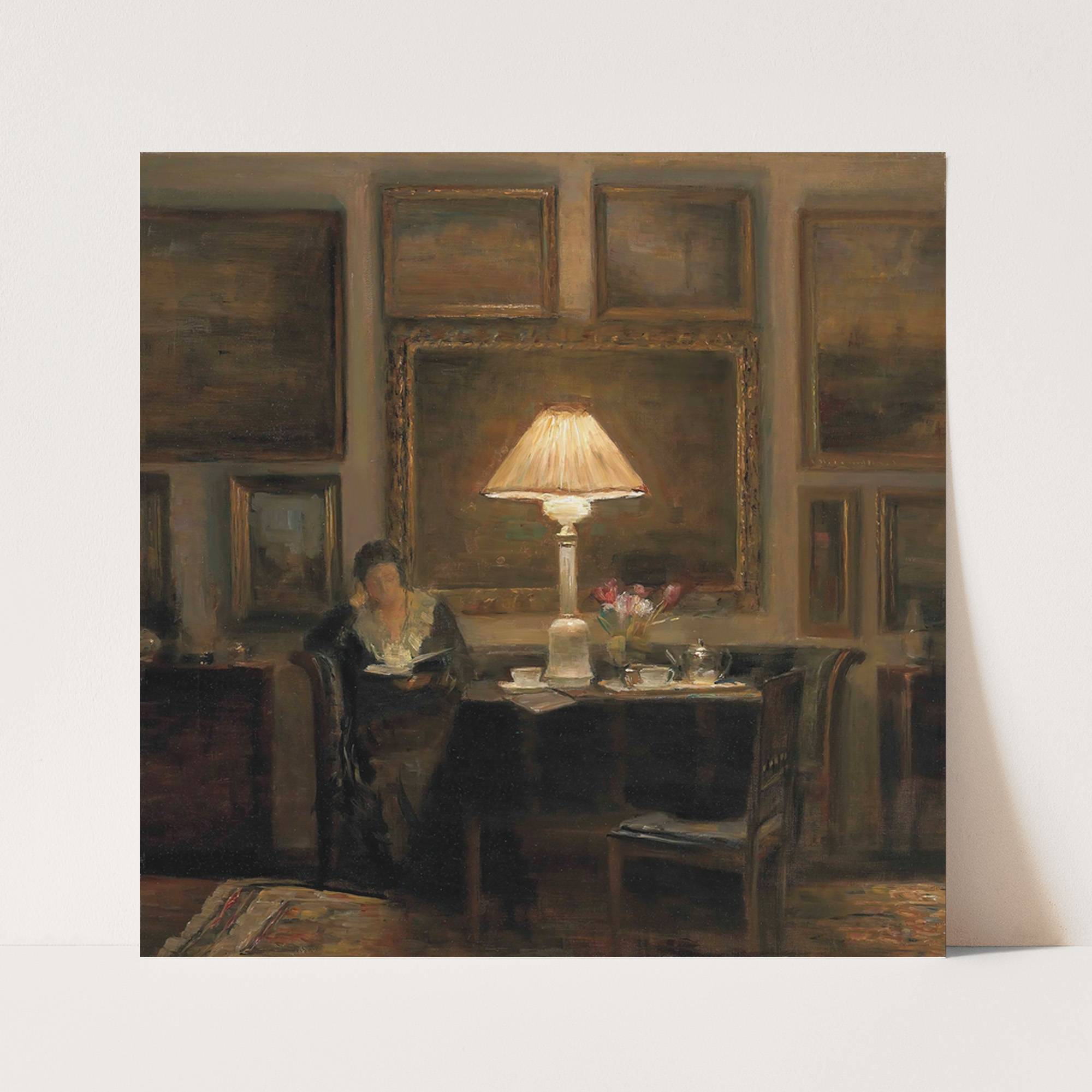 A lady reading by lamplight by Carl Holsøe - Wall Art Print