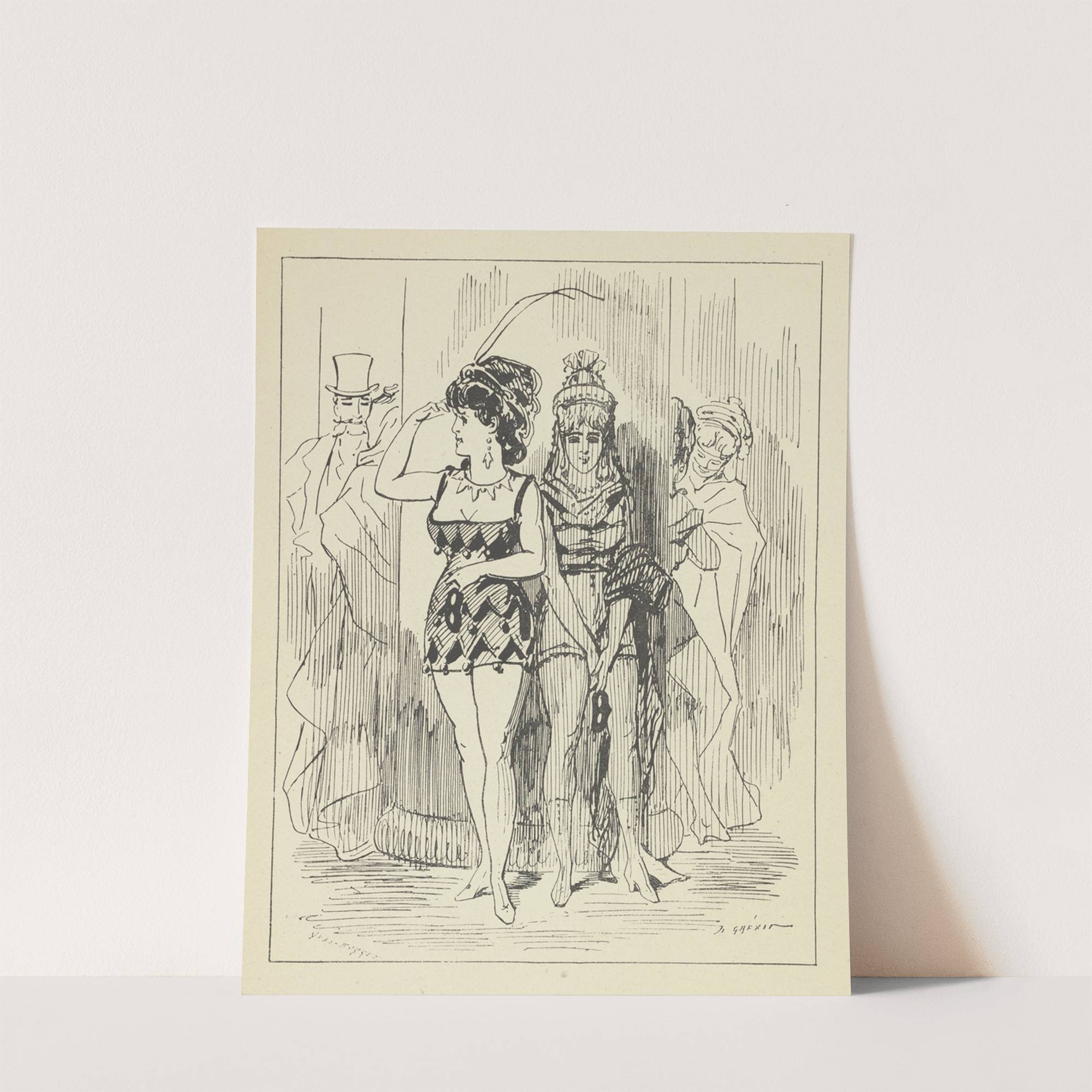 This black-and-white line drawing by artist Alfred Grévin captures a lively moment from the 19th century. At its center is a young woman with wavy hair, dressed in a stylish outfit featuring a short, checkered skirt and a fitted top....