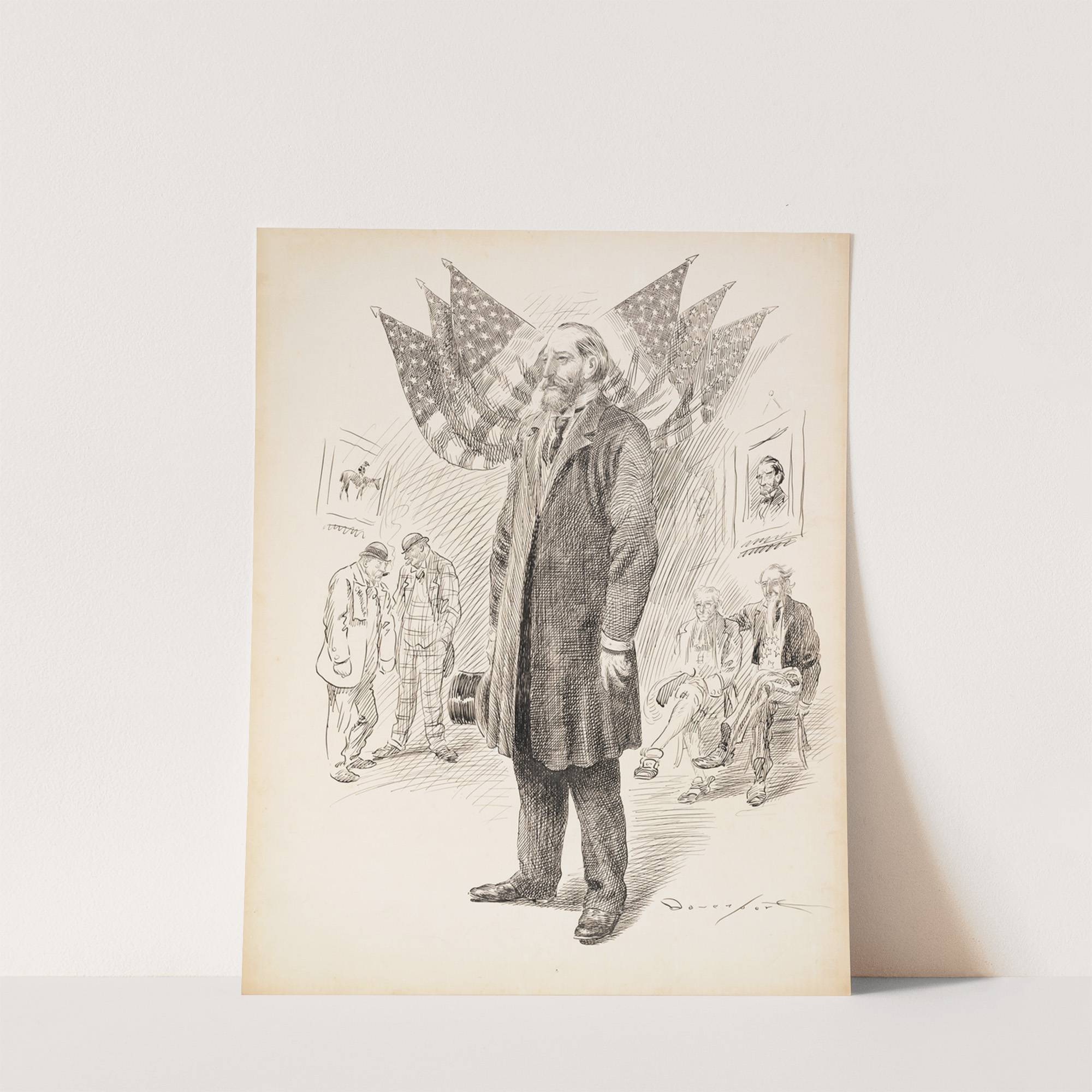 A man in a suit stands in the center with American flags behind him by Homer Davenport - Wall Art Print