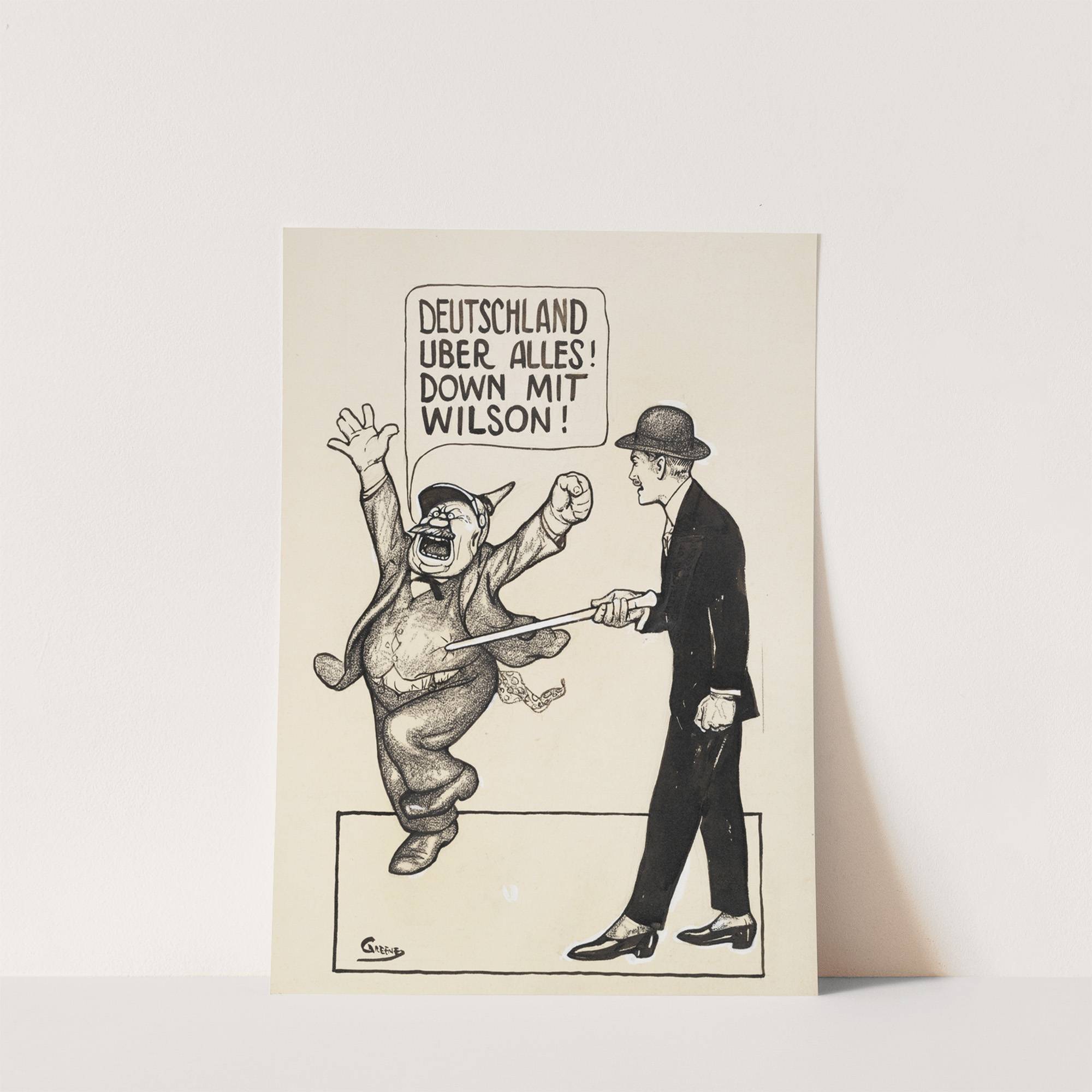 A man uses his cane to poke a fat man who is shouting ‘Deutschland uber allies! Down mit Wilson!’ by Nelson Greene - Wall Art Print