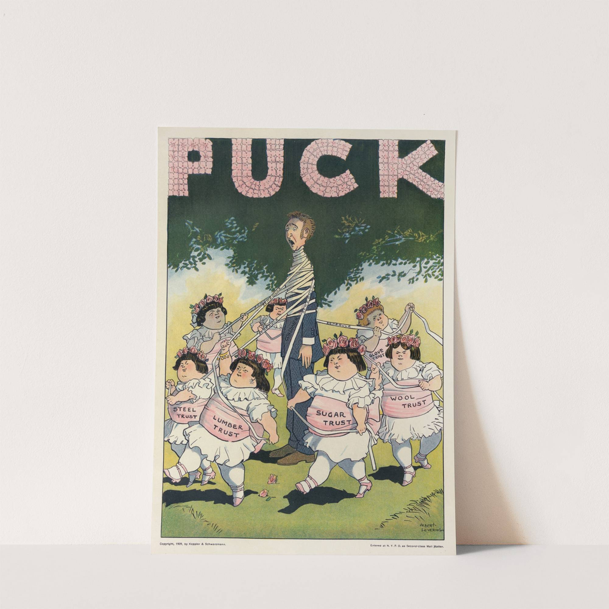 This vibrant illustration titled "Fuck" by Albert Levering features a humorous and provocative scene in a playful, cartoon style. The central figure is a tall man with short brown hair, dressed in a dark blue striped suit, standing with an...