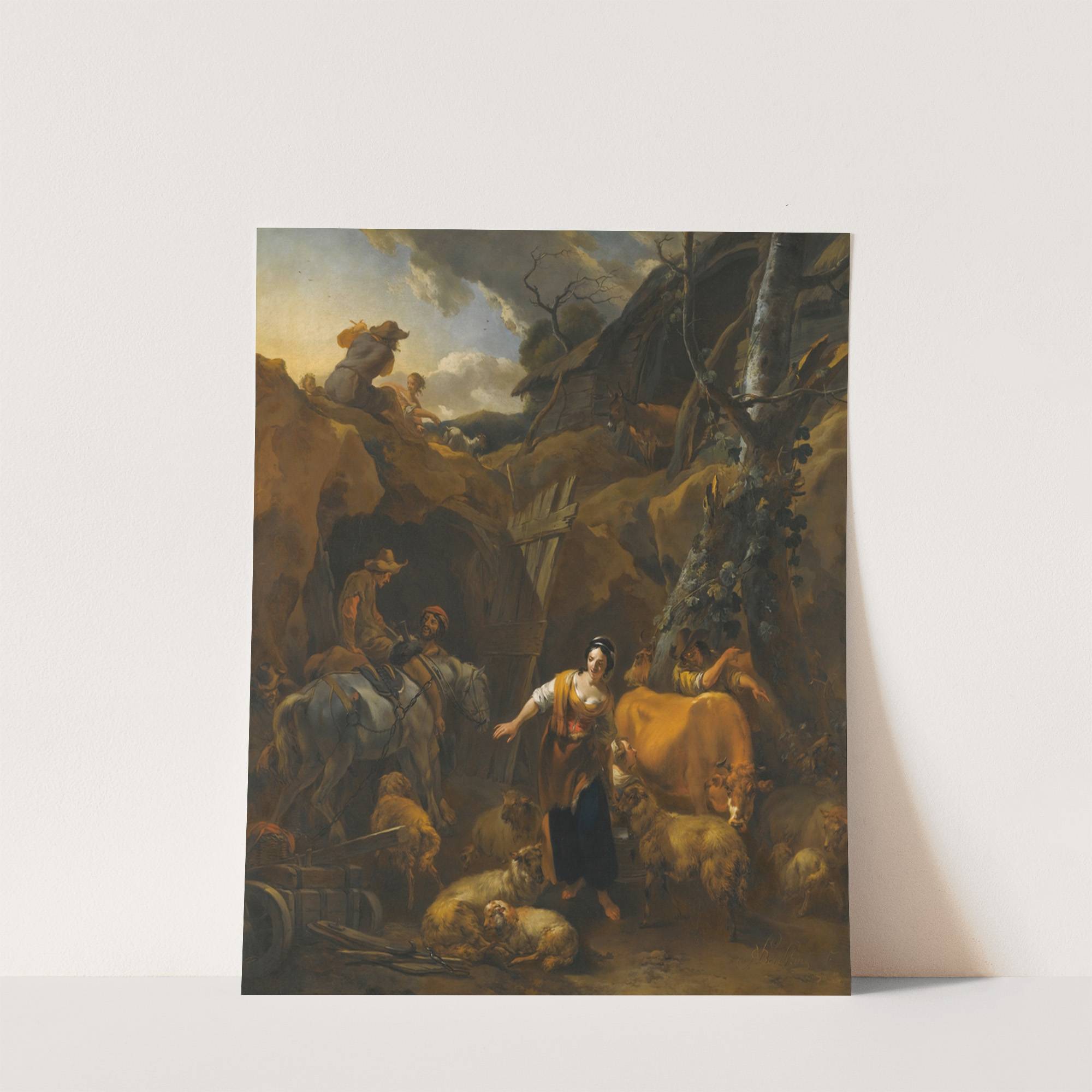 A mountainous italianate landscape with milkmaids and other figures by Nicolaes Pietersz. Berchem - Wall Art Print