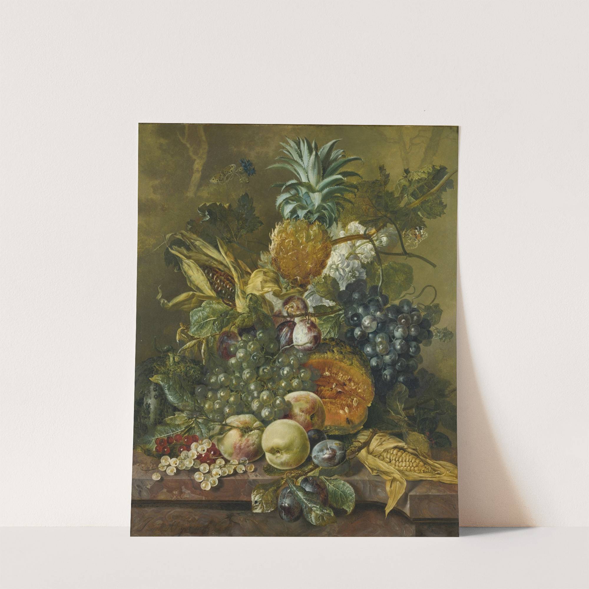 A pineapple, plums, grapes and other fruit with corn on a marble ledge by Jacobus Linthorst - Wall Art Print
