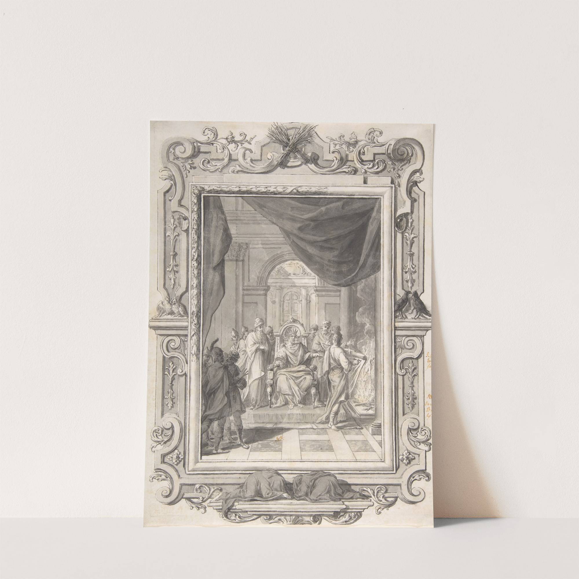 This exquisite monochromatic print features "A Scene of Judgment" by the renowned artist Johann Melchior Füssli. The artwork is framed in an ornate, classical-style border adorned with intricate scrollwork, cherubs, and floral motifs. The central scene depicts a solemn gathering...