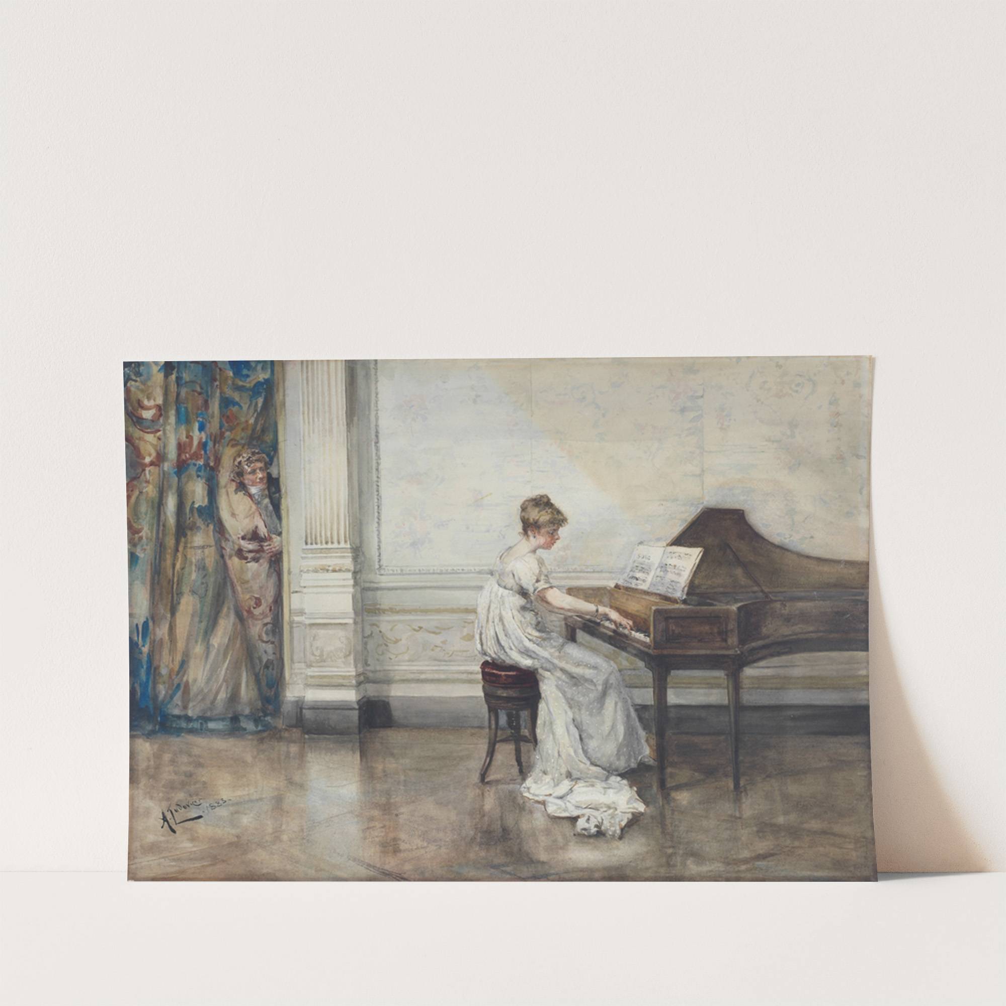This beautiful artwork titled "A Secret Admirer" by Albert Ludovici depicts an elegant scene in a classic setting. The central figure is a young woman with delicate features, seated at a grand piano, deeply engrossed in playing music. She has...