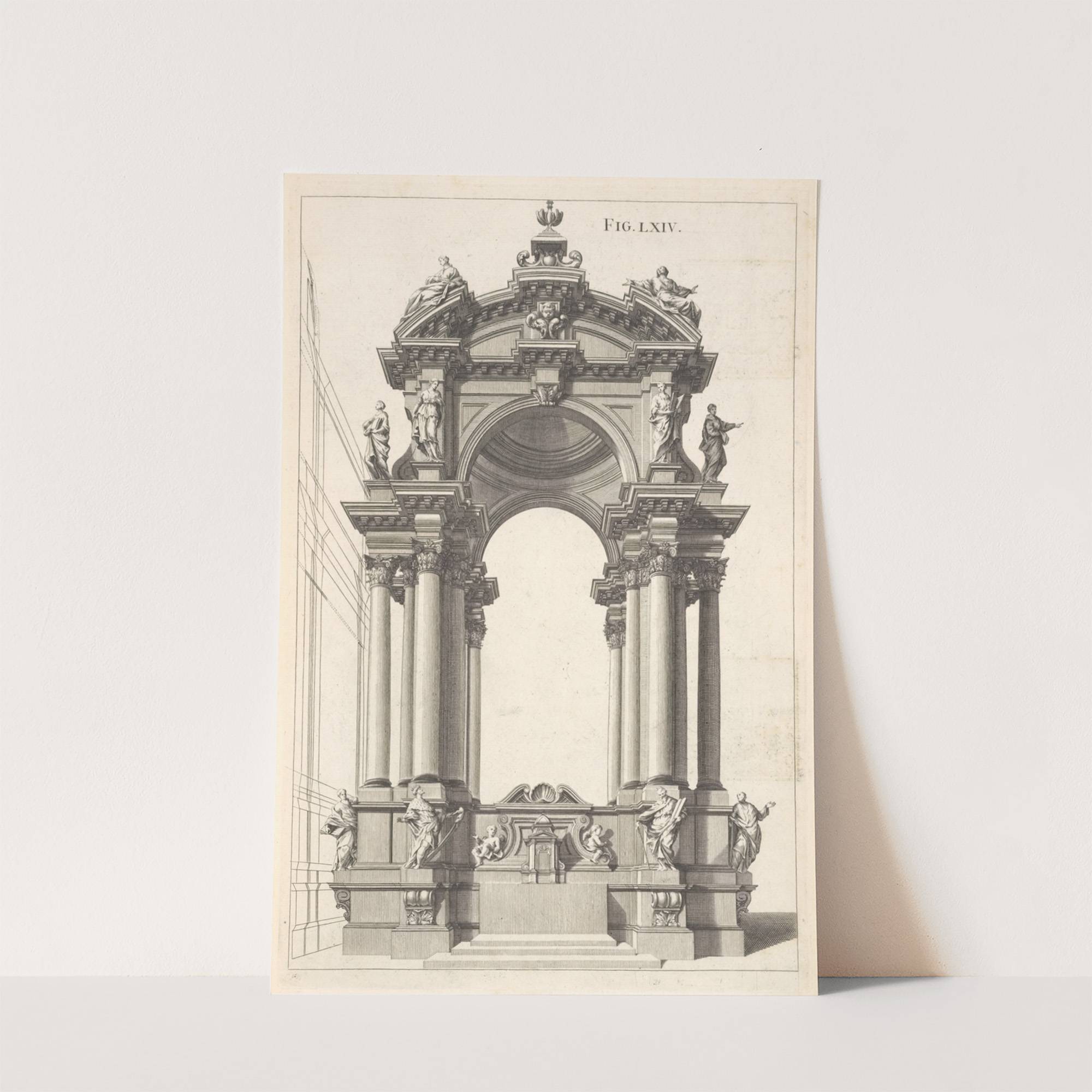 Discover the grandeur of classical architecture with this striking black-and-white illustration of an ornate Baroque-style triumphal arch. The detailed monochrome drawing captures the intricate carvings, statues, and columns that define this majestic structure. The central archway is flanked by tall,...