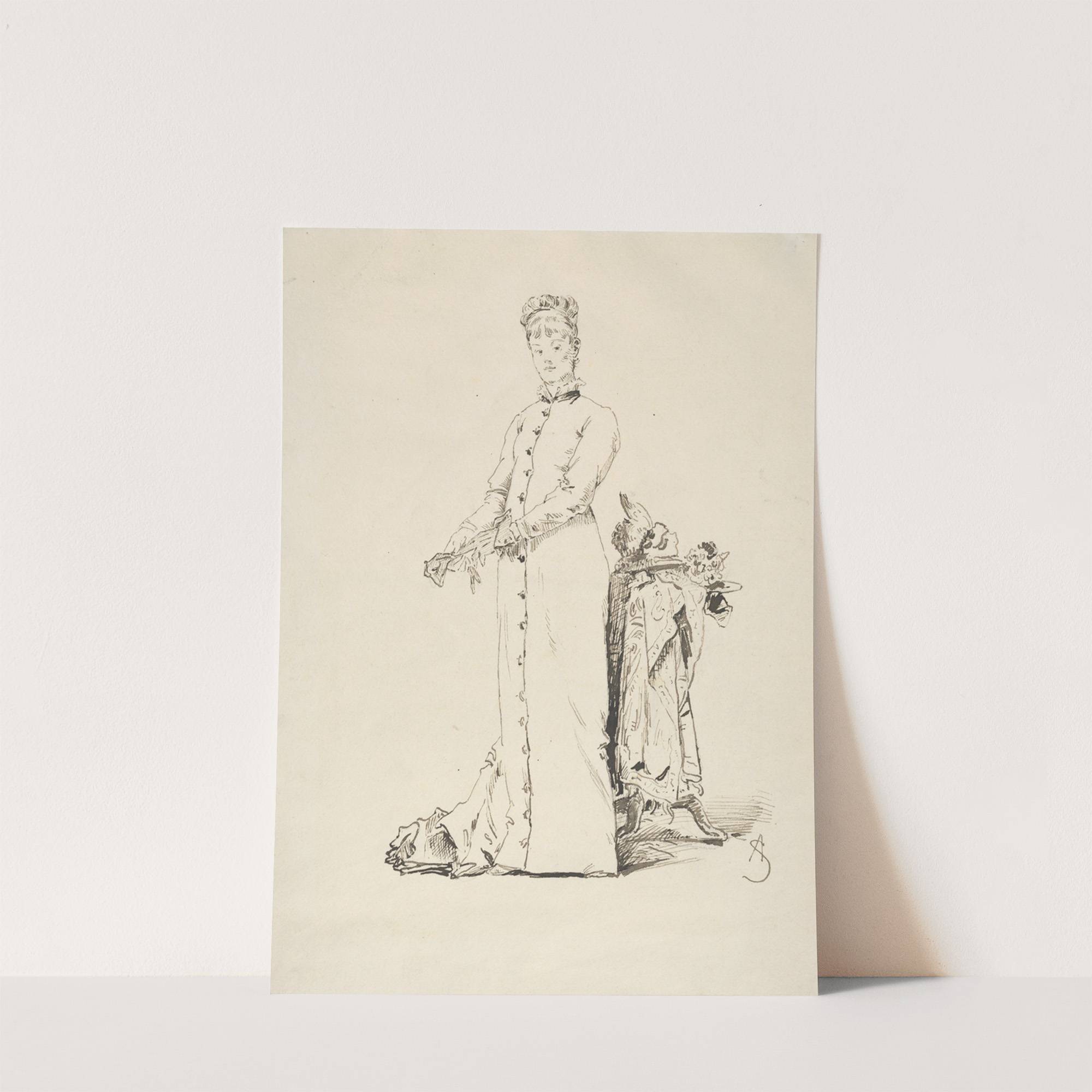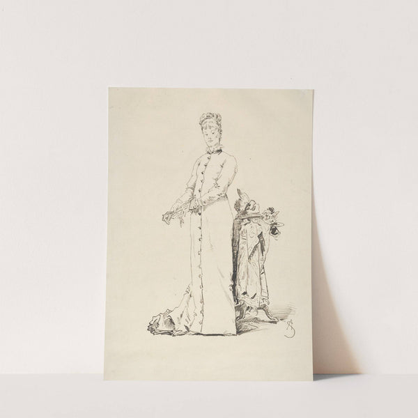 This black-and-white line drawing features "A Standing Young Lady Taking Off Her Gloves" by Alfred Stevens. The young woman stands gracefully, with her right hand poised to remove her gloves. She is dressed in a long, elegant dress that reaches...