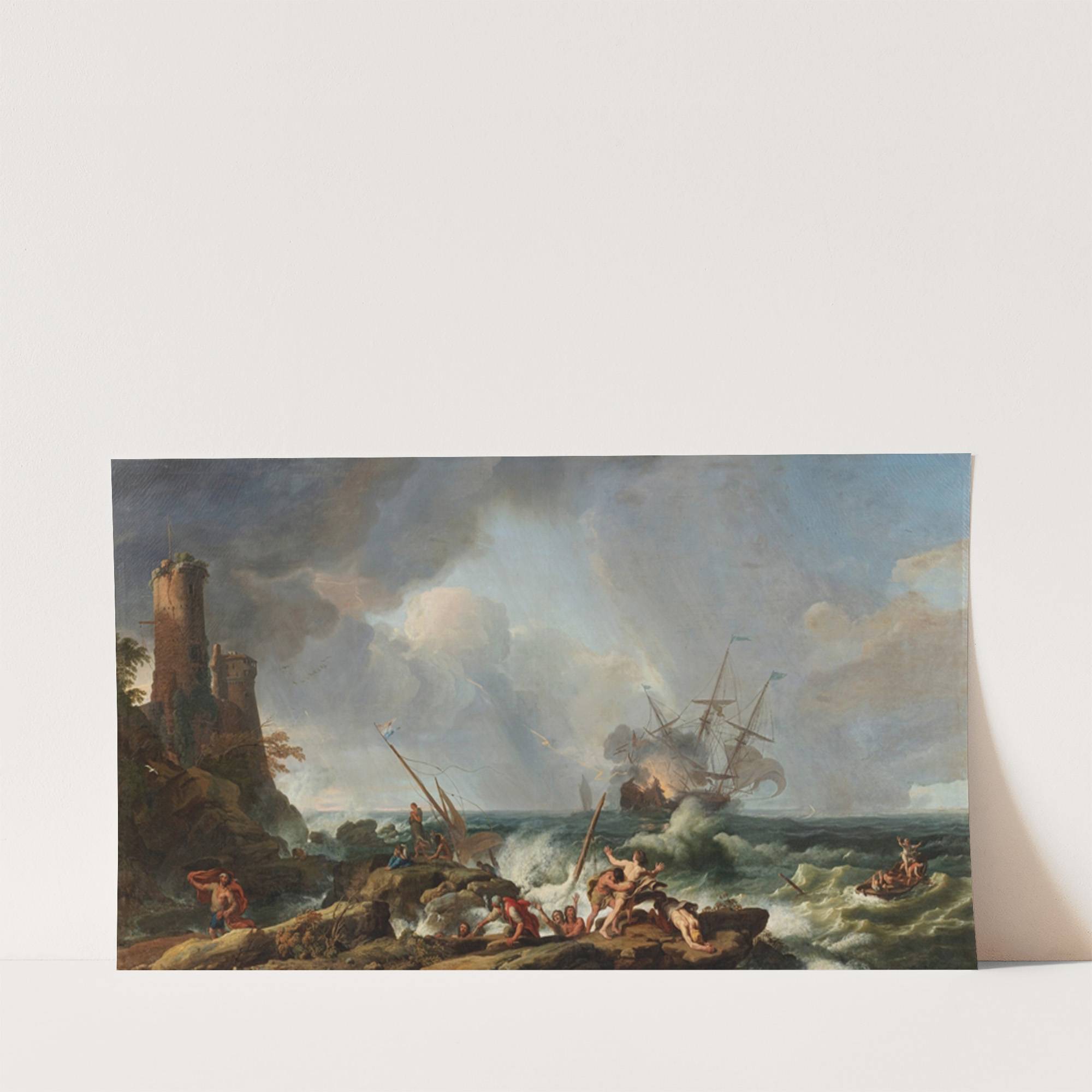 This vibrant oil painting titled "A Storm on a Rocky Coast" by Adrien Manglard captures the raw power of nature in a dramatic seascape scene. Dominating the foreground, several struggling sailors are depicted amidst turbulent waves and raging sea foam,...