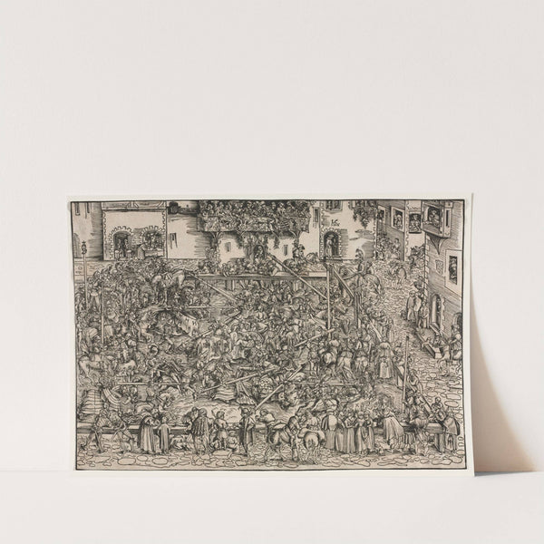 This intricate black-and-white woodcut print titled "A Tournament" by Lucas Cranach the Elder captures a bustling medieval scene teeming with activity. The detailed illustration features numerous figures engaged in various activities, set against a backdrop of a cobblestone street lined...