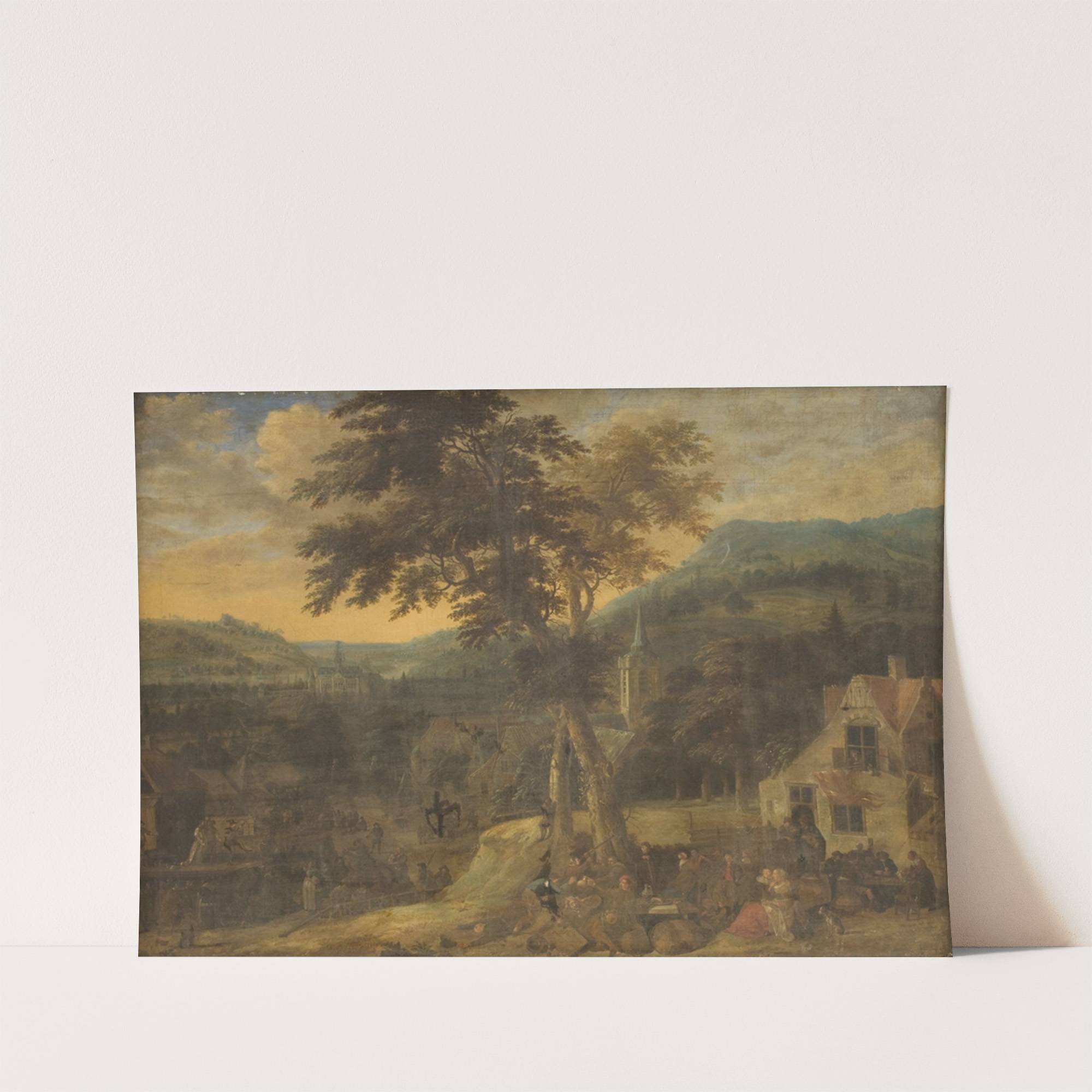 This artwork is a beautiful oil painting titled "A Village Celebration" by Gerrit Battem. It features a serene village scene bathed in the warm glow of a setting sun that illuminates the landscape with golden hues. The painting captures a...