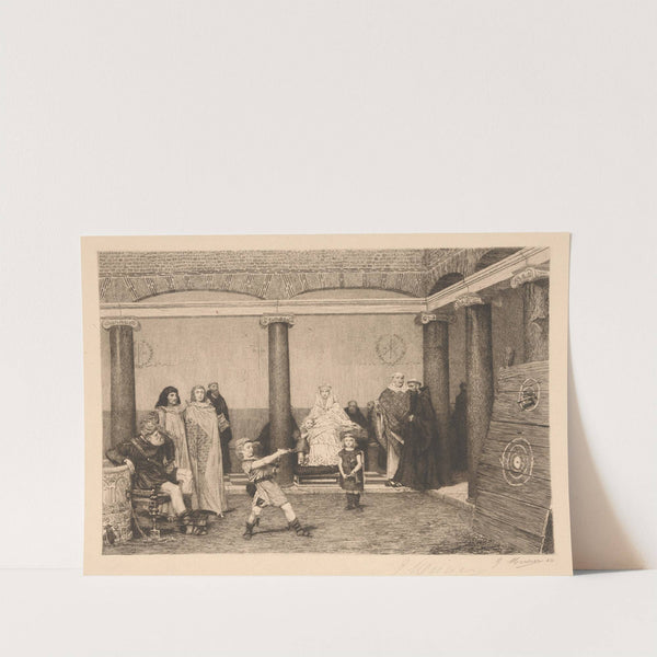 A woman in a gown begins to climb a staircase in a dark room (1893) by Harold Imbrie - Wall Art Print