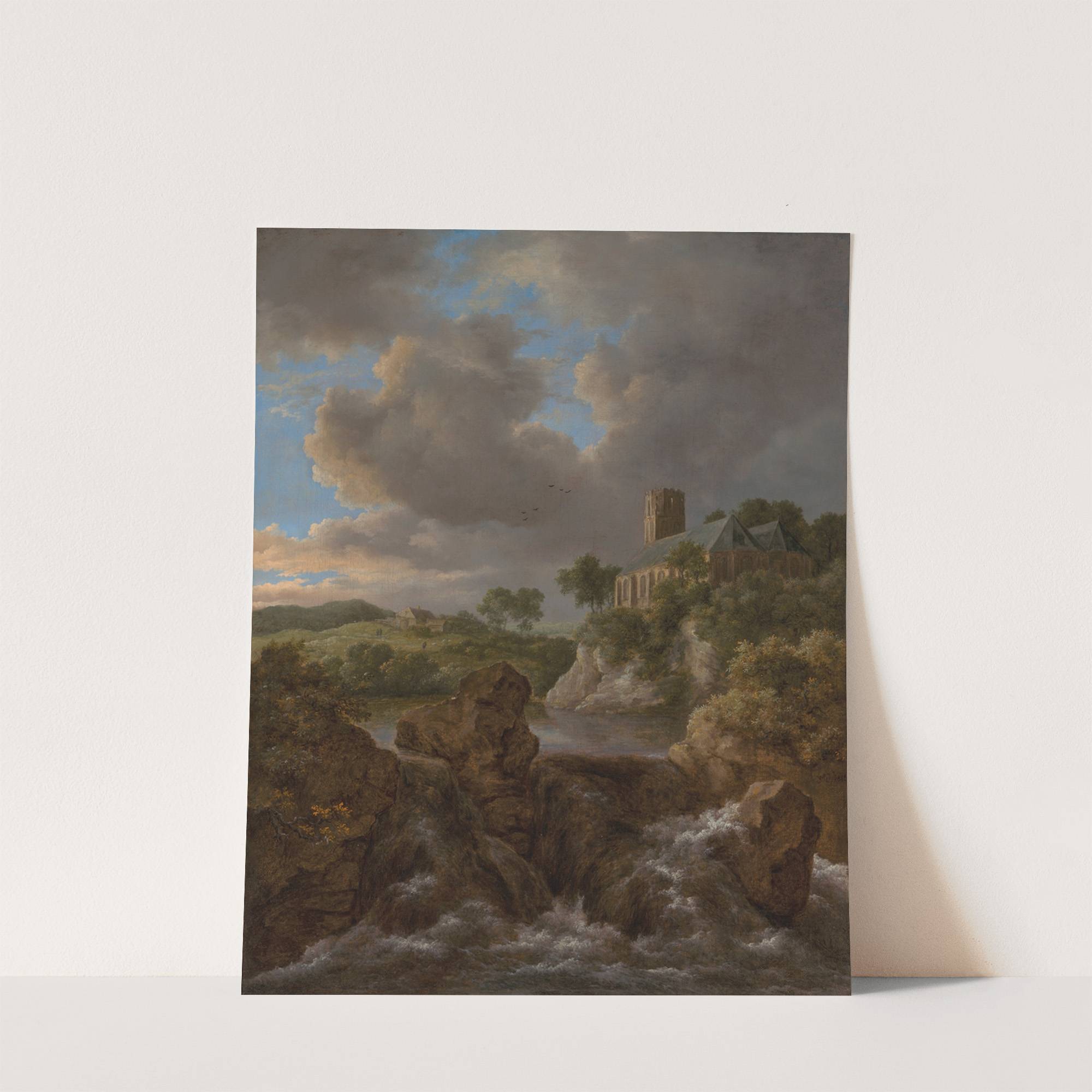 A wooded river landscape with a waterfall, a church and farm beyond by Jacob van Ruisdael - Wall Art Print