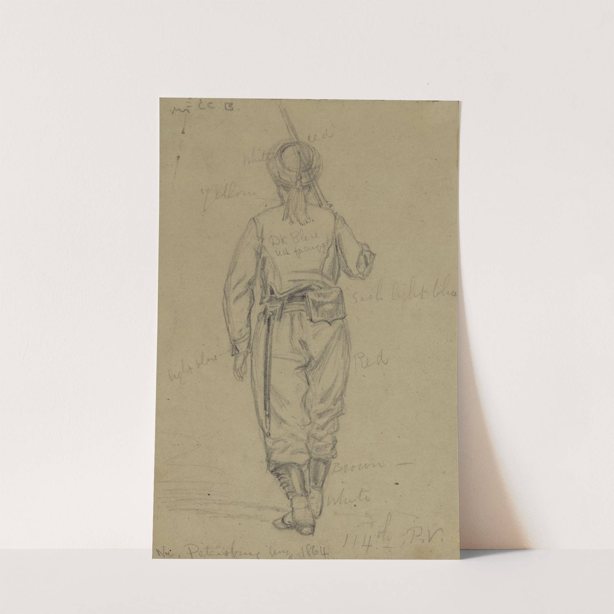 This art print features "A Zouave Sentry" by Alfred Rudolph Waud, a delicately detailed pencil sketch on aged paper. The subject is a Zouave soldier depicted from the back, with attention to the intricate details of his uniform and equipment....