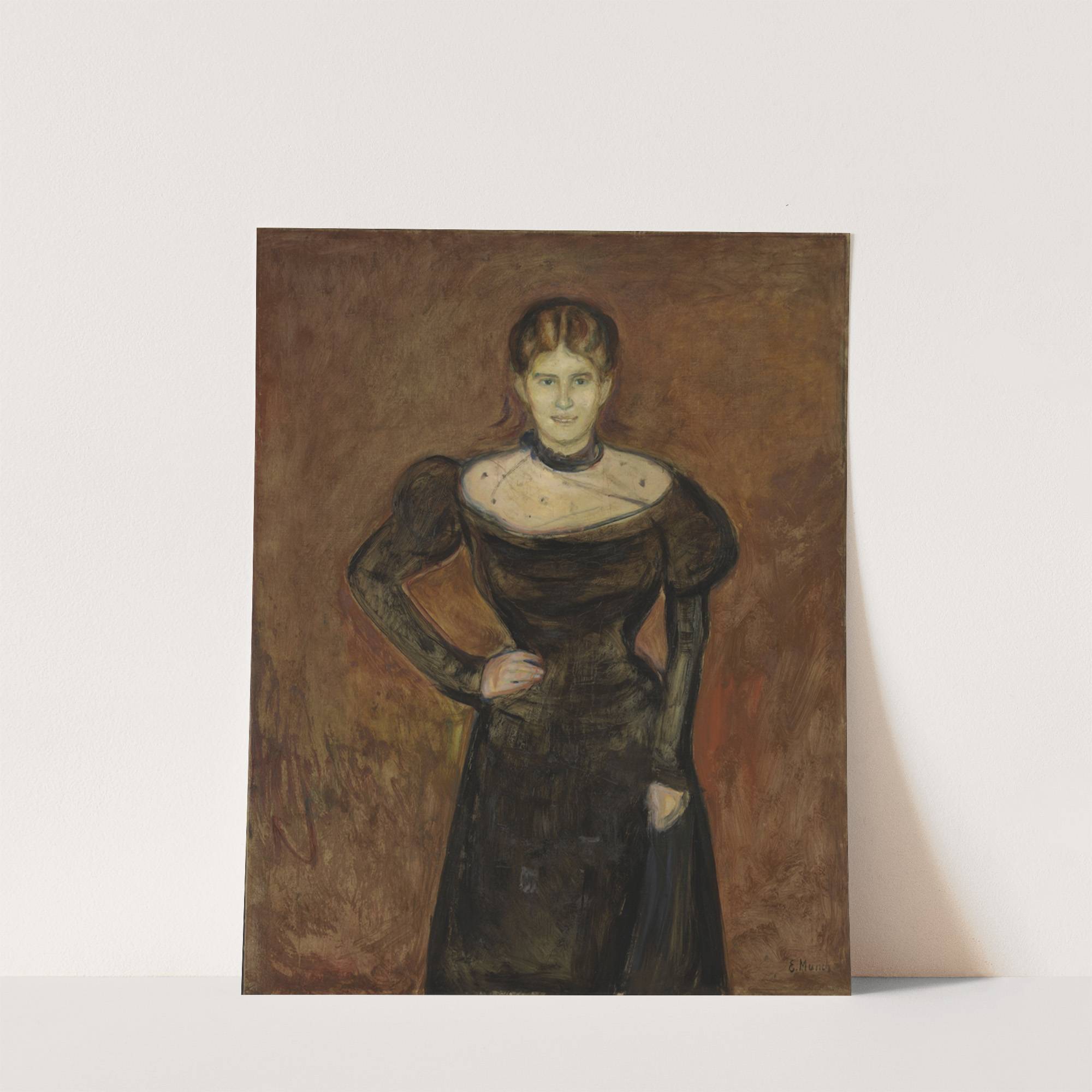 This artwork is a captivating portrait by the renowned artist Edvard Munch titled "Aase Nørregaard." It features a woman standing confidently against a textured brown background that adds depth to the composition. The woman's pose exudes poise and strength, with...