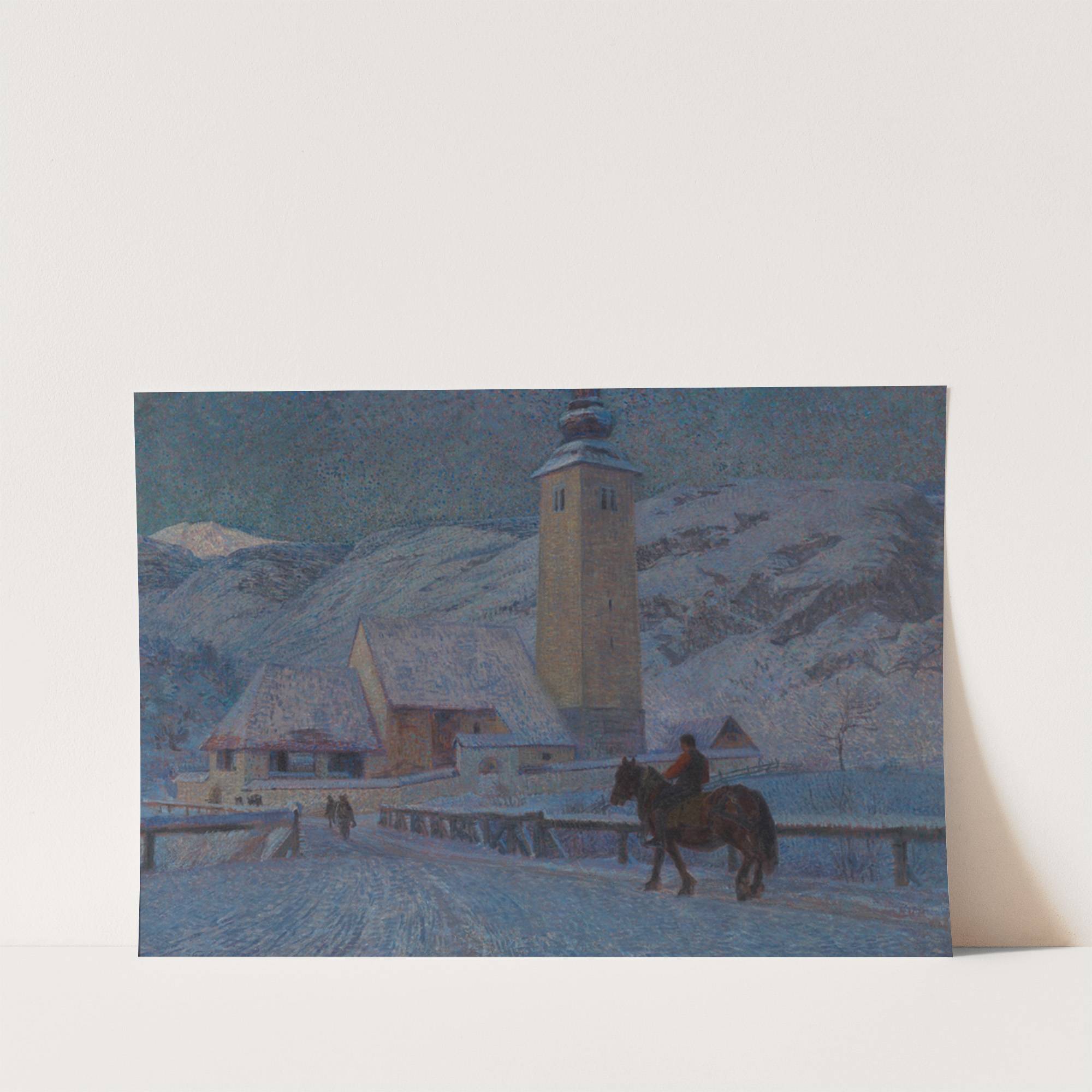 This stunning artwork by Ernst Stöhr titled "Abendläuten (Gebirgsdorf)" captures the serene beauty of a snowy winter village scene. The painting features a tall, cylindrical church tower at its center, with a distinct top section capped in white snow. Surrounding...