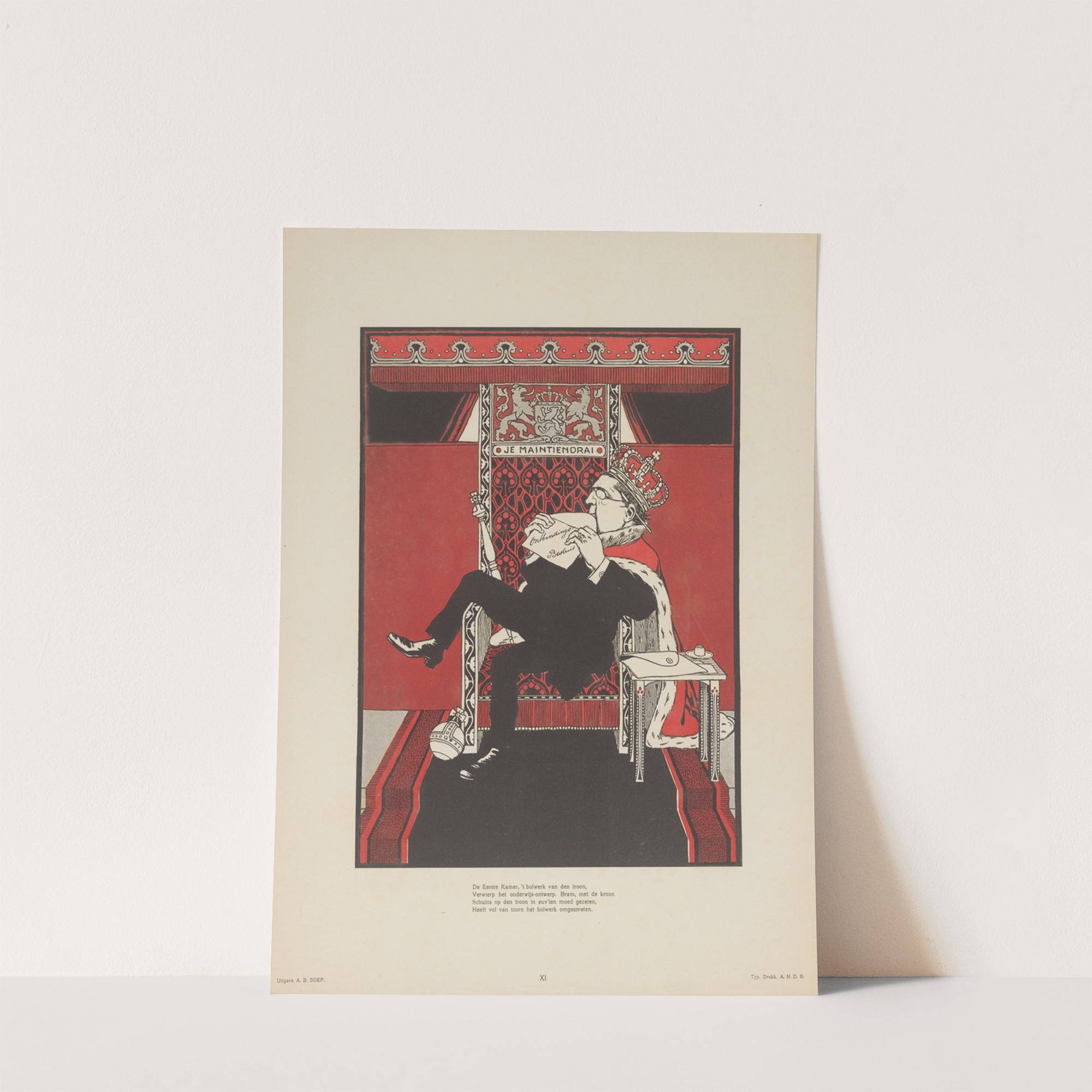 This print features "Abraham Kuyper op de troon" by artist Albert Hahn, executed in a striking Art Nouveau style. The central figure is a regal man seated on an ornate throne with intricate carvings and a dramatic backdrop of red...