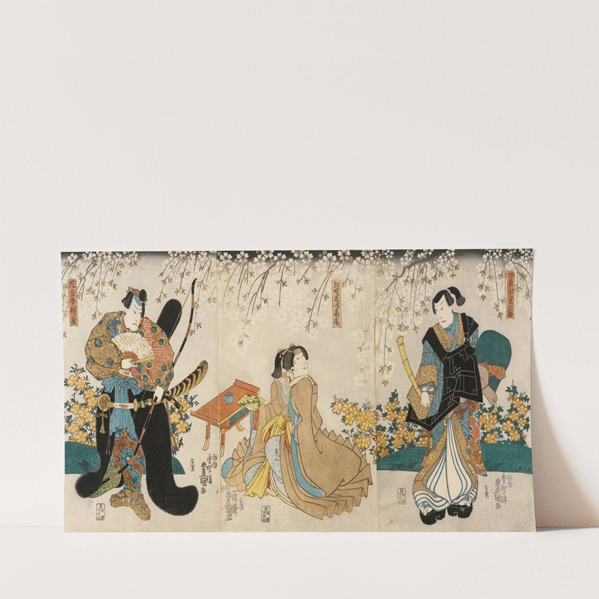 Actors in the Roles of Shimada Shigesaburō, Kugyō ama jitsuwa Takao and Sakingo Yorikane under Cherry Blossoms (circa 1850) by Utagawa Kunisada (Toyokuni III) - Wall Art Print