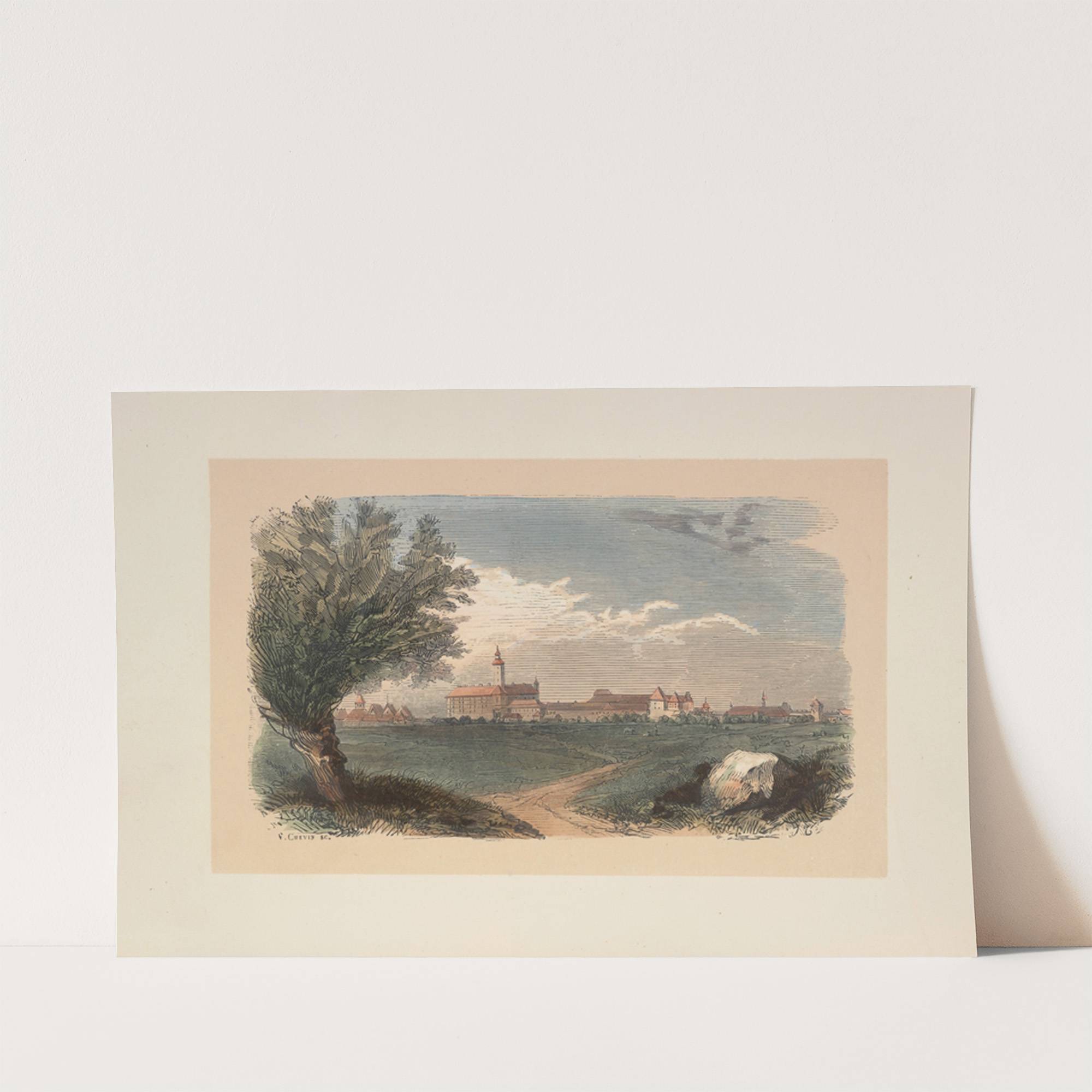 This beautiful landscape print captures the serene charm of a rural setting, expertly rendered in a classic, nostalgic style reminiscent of traditional etching techniques. The scene is dominated by a tall, leafy tree on the left side, its branches extending...