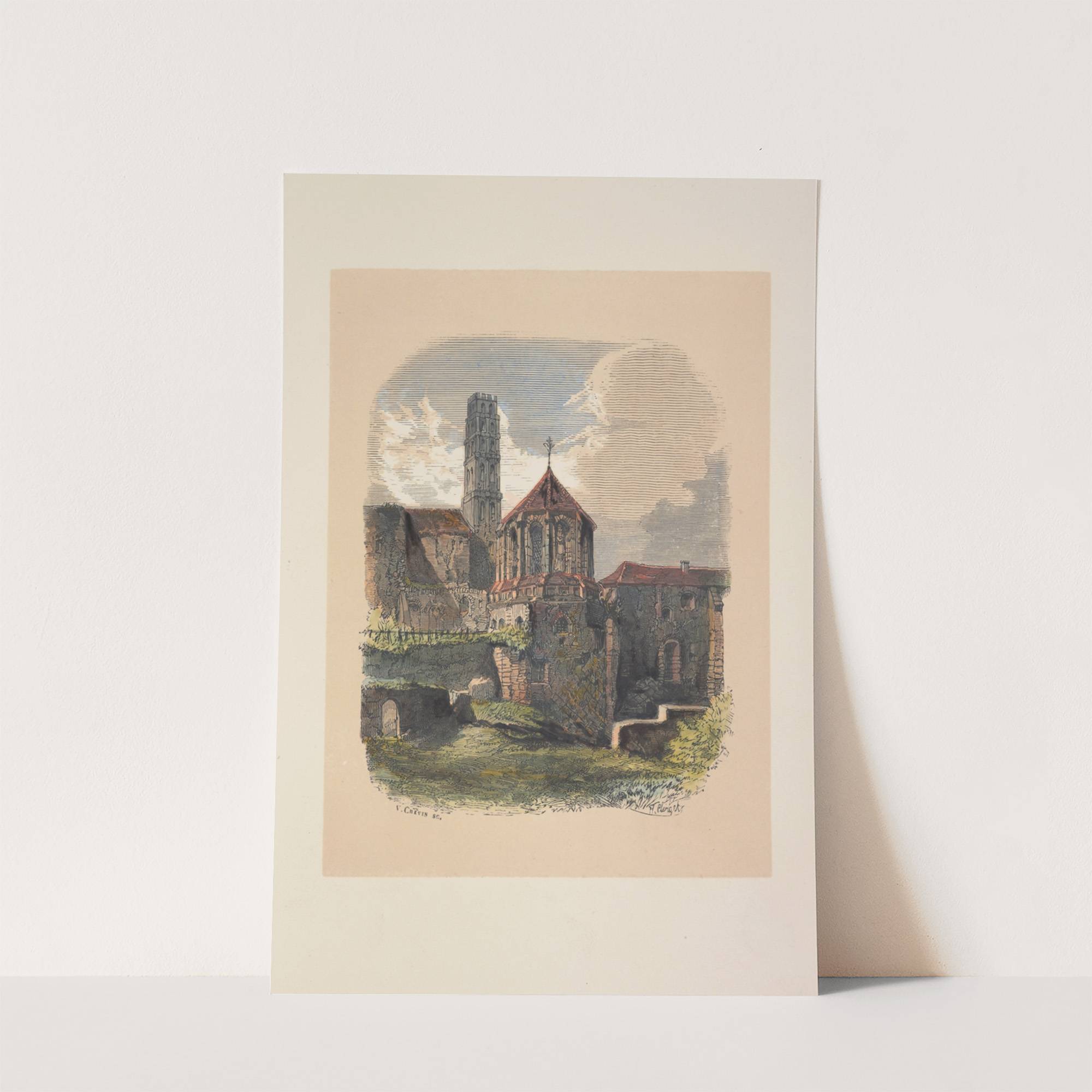 This elegant art print features "Adama Mickiewicza Konrad Wallenrod i Grażyna Pl.05 (1851)" by Adam Mickiewicz, showcasing a picturesque medieval village scene rendered in rich, detailed strokes of color and texture. The central focus is an ancient stone church with...