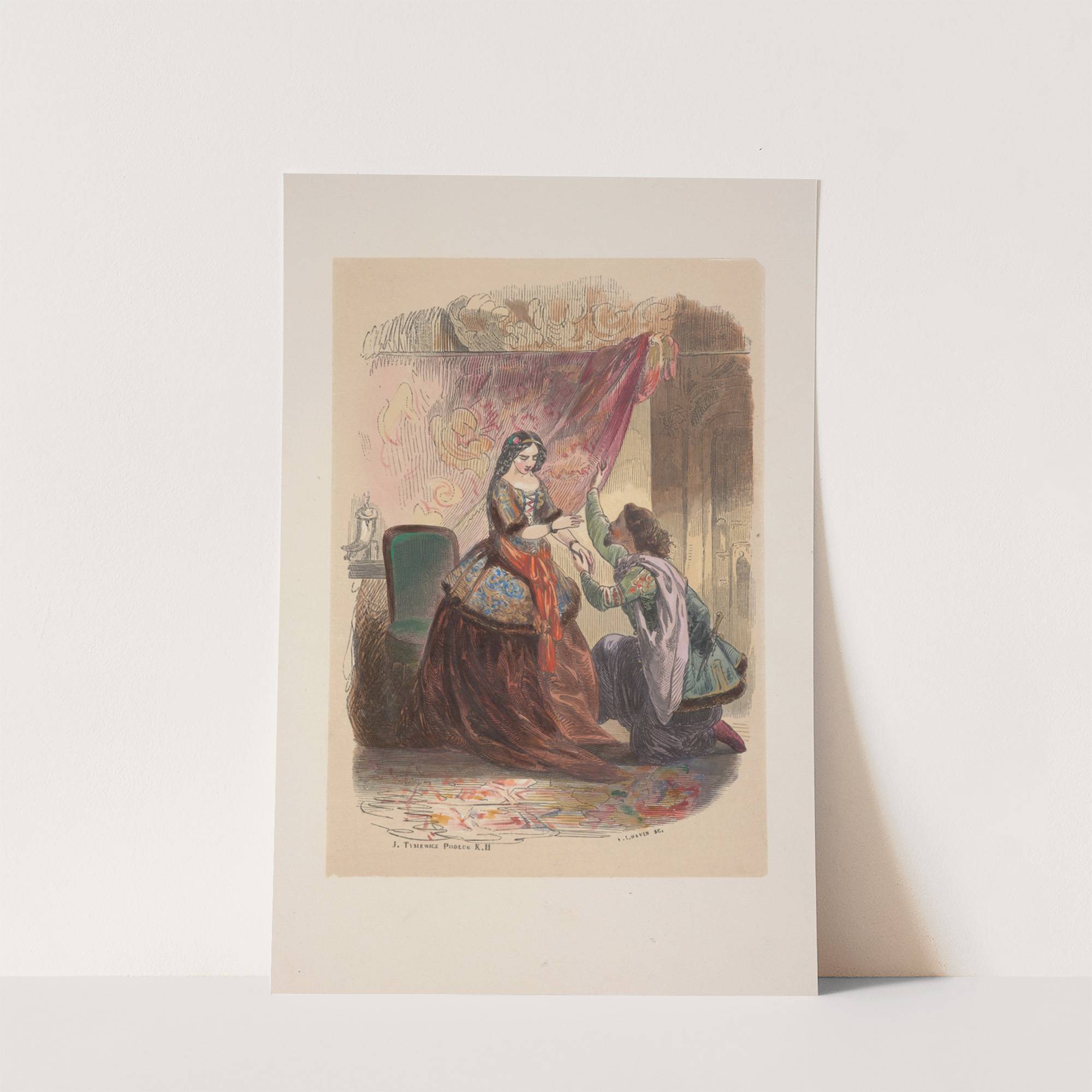 This art print features an exquisite illustration from the classic Polish painting "Konrad Wallenrod i Grażyna" by Adam Mickiewicz, created in a vibrant and detailed style. The scene depicts a romantic moment between Konrad and Grażyna, set against a richly...