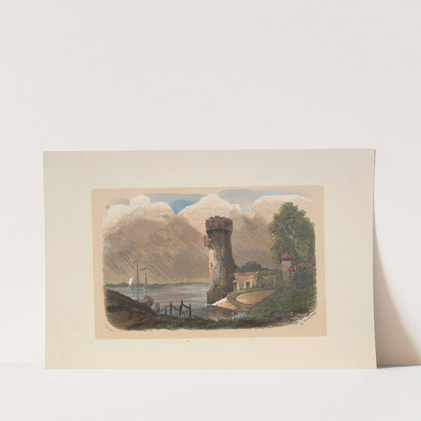 This vibrant art print captures the serene beauty of an ancient water tower standing tall over a tranquil river landscape, rendered in a classical style. The artist expertly uses warm and cool tones to bring out the intricate details and...