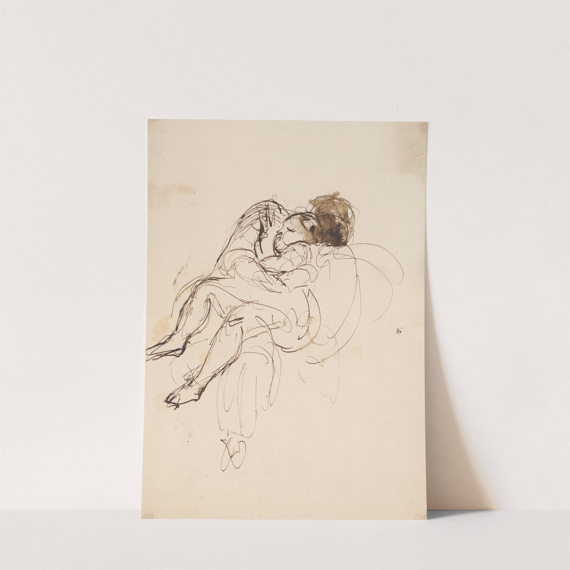 This art print features "Adult and Child" by Sir Joshua Reynolds, a beautifully expressive sketch in a loose, yet elegant style. The composition captures an intimate moment between two figures, both rendered with delicate, flowing lines that convey movement and...