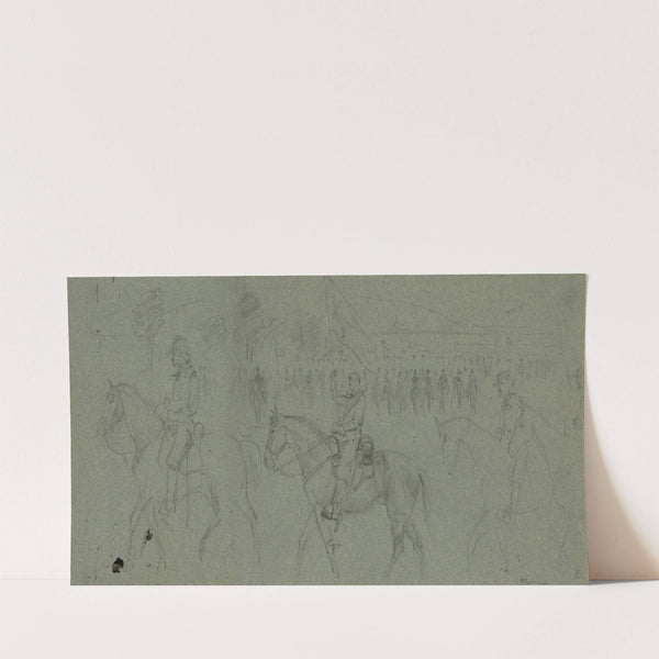 This is a beautifully delicate pencil sketch titled "Advance of Custer’s Brigade" by renowned artist Alfred Rudolph Waud. The composition depicts a historical military scene with meticulous attention to detail, rendered in soft, monochromatic pencil tones on textured paper that...