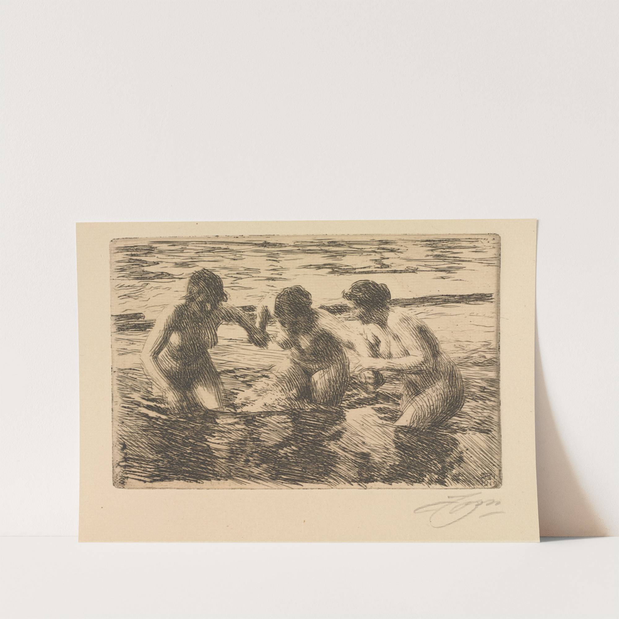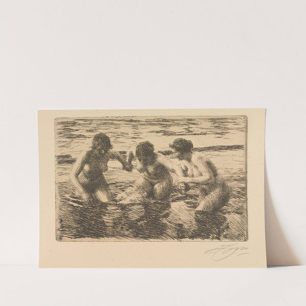 This art print features a timeless black-and-white etching titled "Against the Current" by renowned artist Anders Zorn. The piece captures three nude children interacting playfully in shallow water. Their figures are rendered with meticulous cross-hatching, creating a textured effect that...