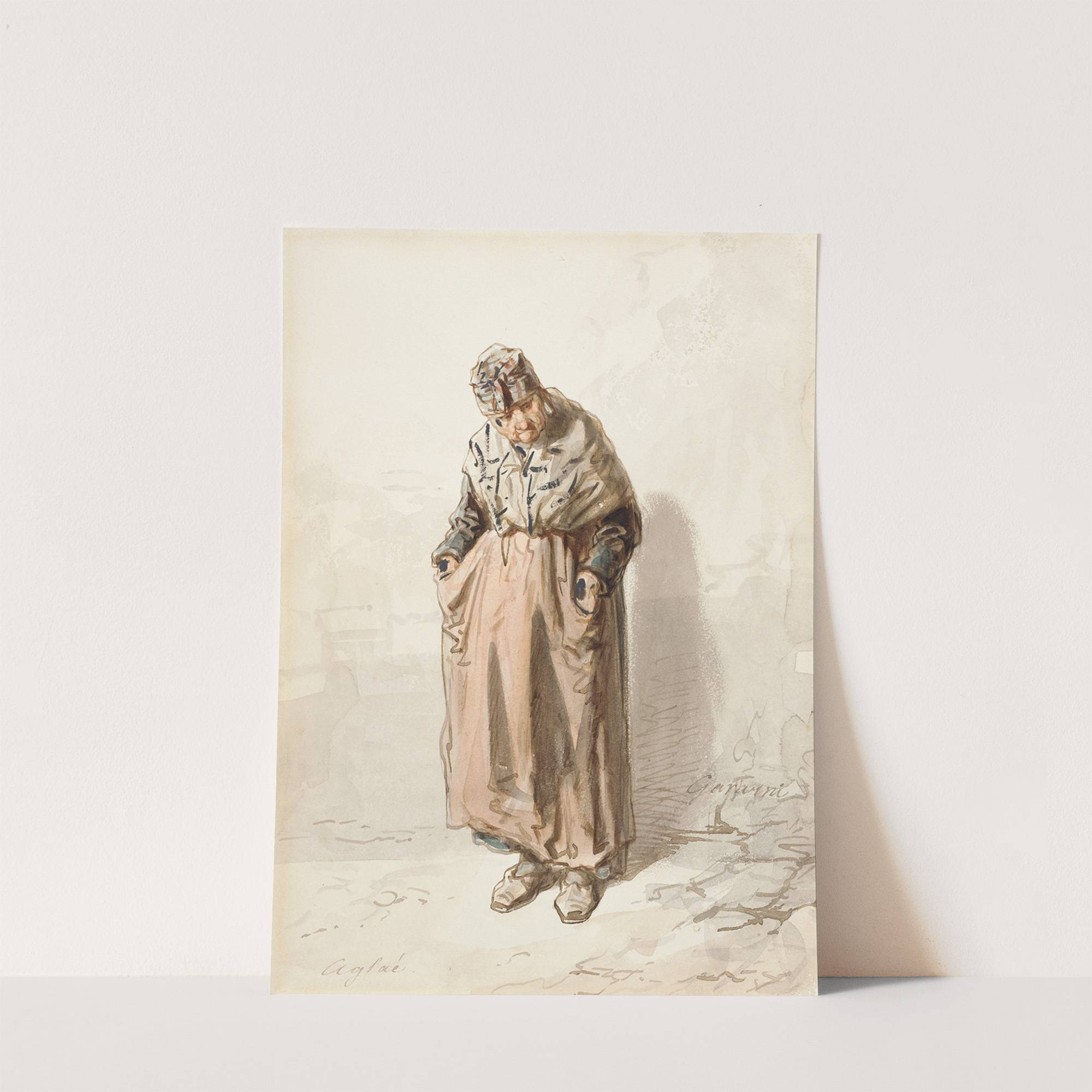 This print features "Aglaé" by the renowned artist Paul Gavarni, showcasing a beautifully detailed and contemplative depiction of a woman in traditional attire. The subject is rendered with careful attention to texture and light, bringing out the soft, almost sepia-toned...