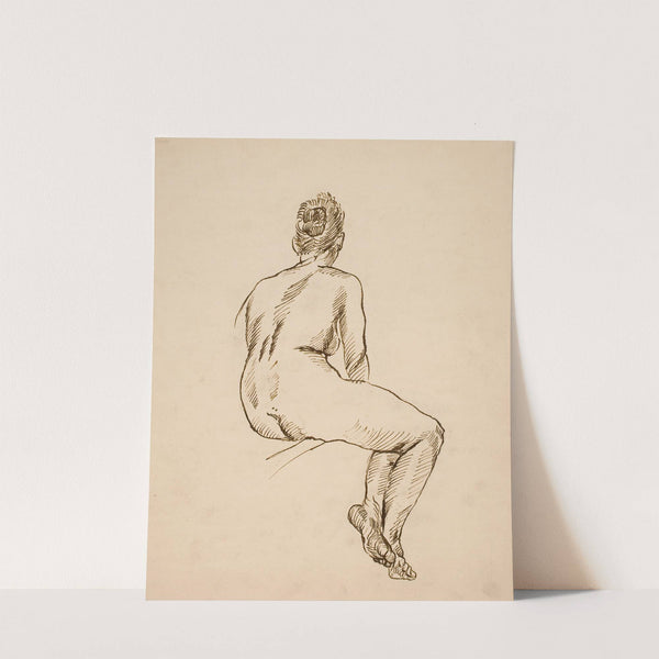 This art print features "Alastonharjoitelma, istuva nainen" by Alfred William Finch, created in an elegant monochromatic ink style. The drawing depicts a seated nude woman viewed from behind, showcasing her back and lower body with meticulous detail and fine lines....