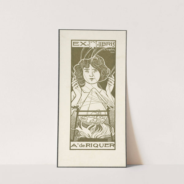 This art print features "Alexandre de Riquer" by the artist of the same name, created in 1900. The piece is rendered in a vintage, monochromatic style with an olive-green tint, capturing the intricate details and artistic elegance typical of early...