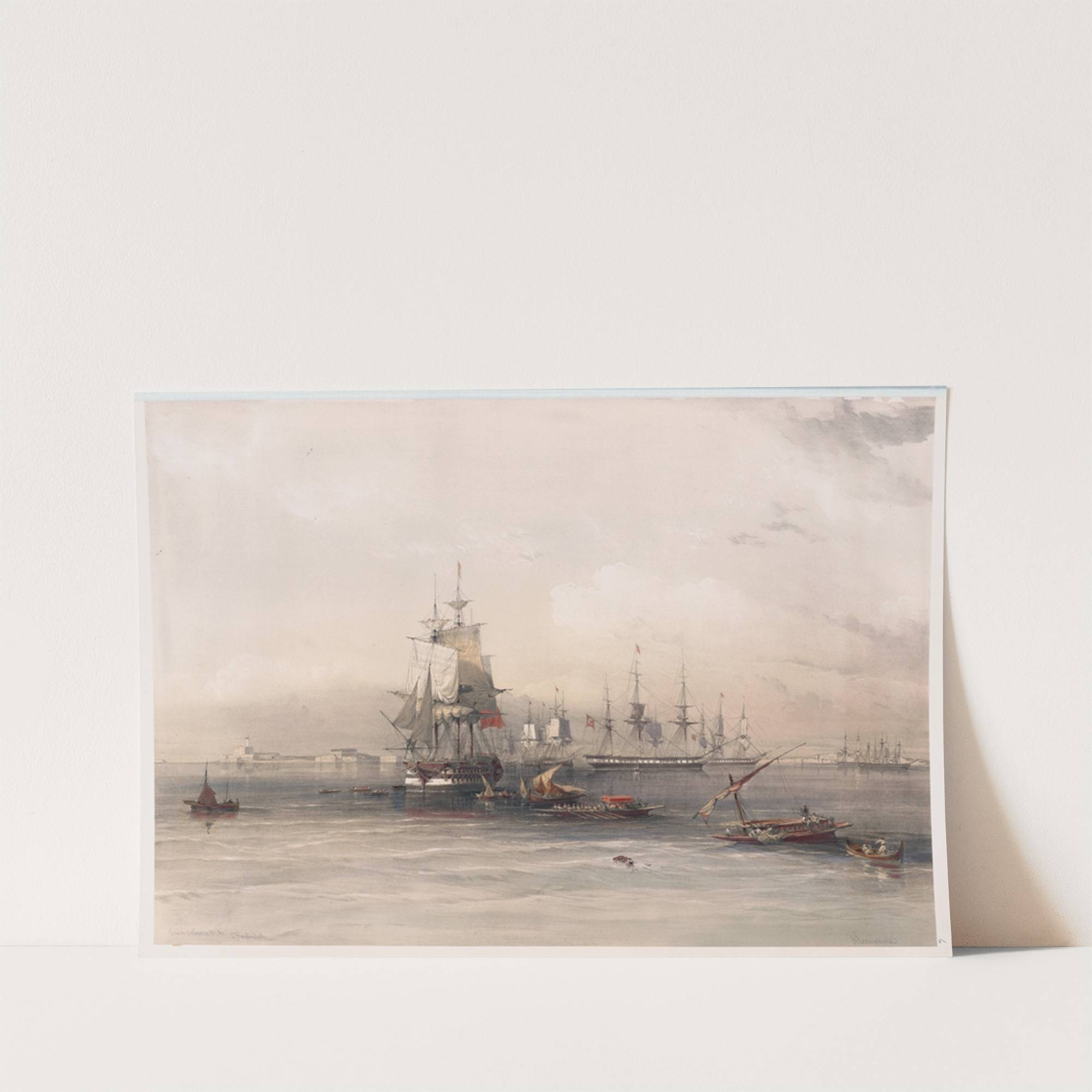 This beautifully rendered art print captures the majestic essence of maritime history. Created by renowned artist David Roberts in his style from 1846 to 1849, this piece showcases an intricate seascape featuring numerous sailing ships anchored together. The focal point...