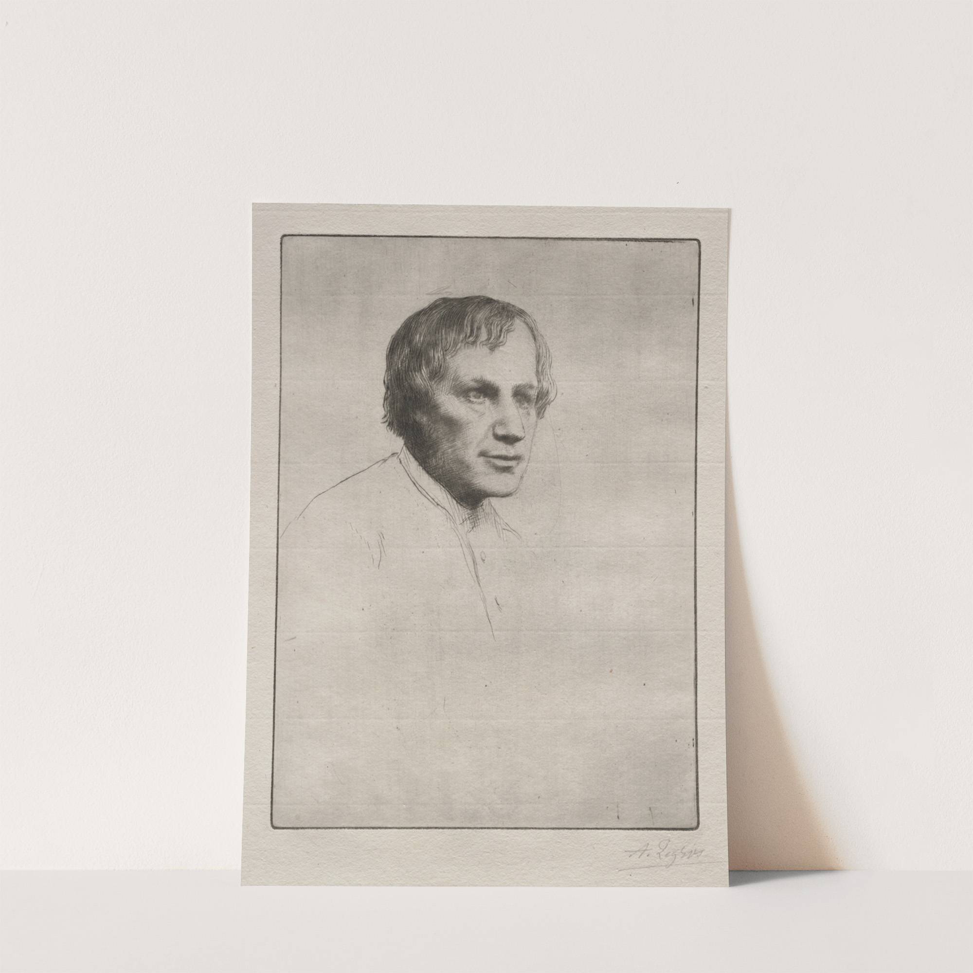 This monochromatic portrait is a delicate pencil drawing on aged, textured paper. The artwork features a man with wavy, medium-length hair that gently frames his face, slightly parted at the center. His expression is calm and introspective, with gentle, slightly...